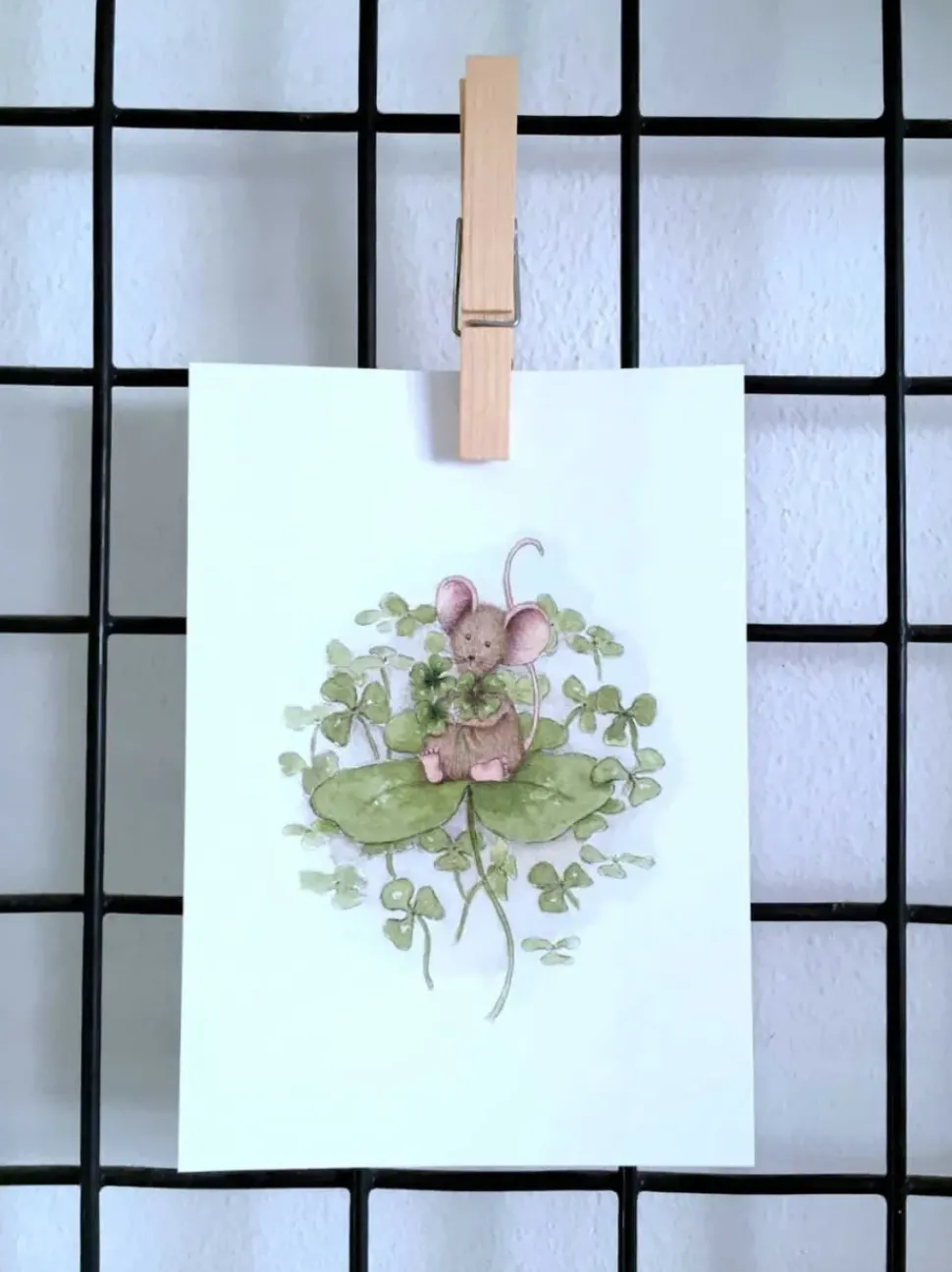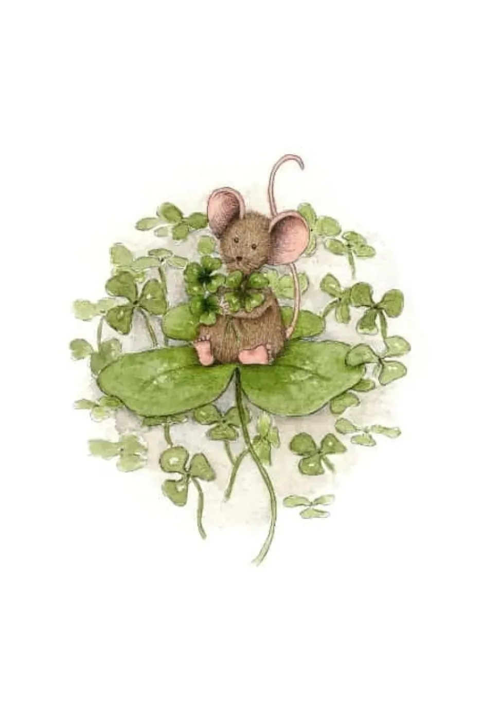 Anillustration Ansichtkaart Muis op/met klavertje vier