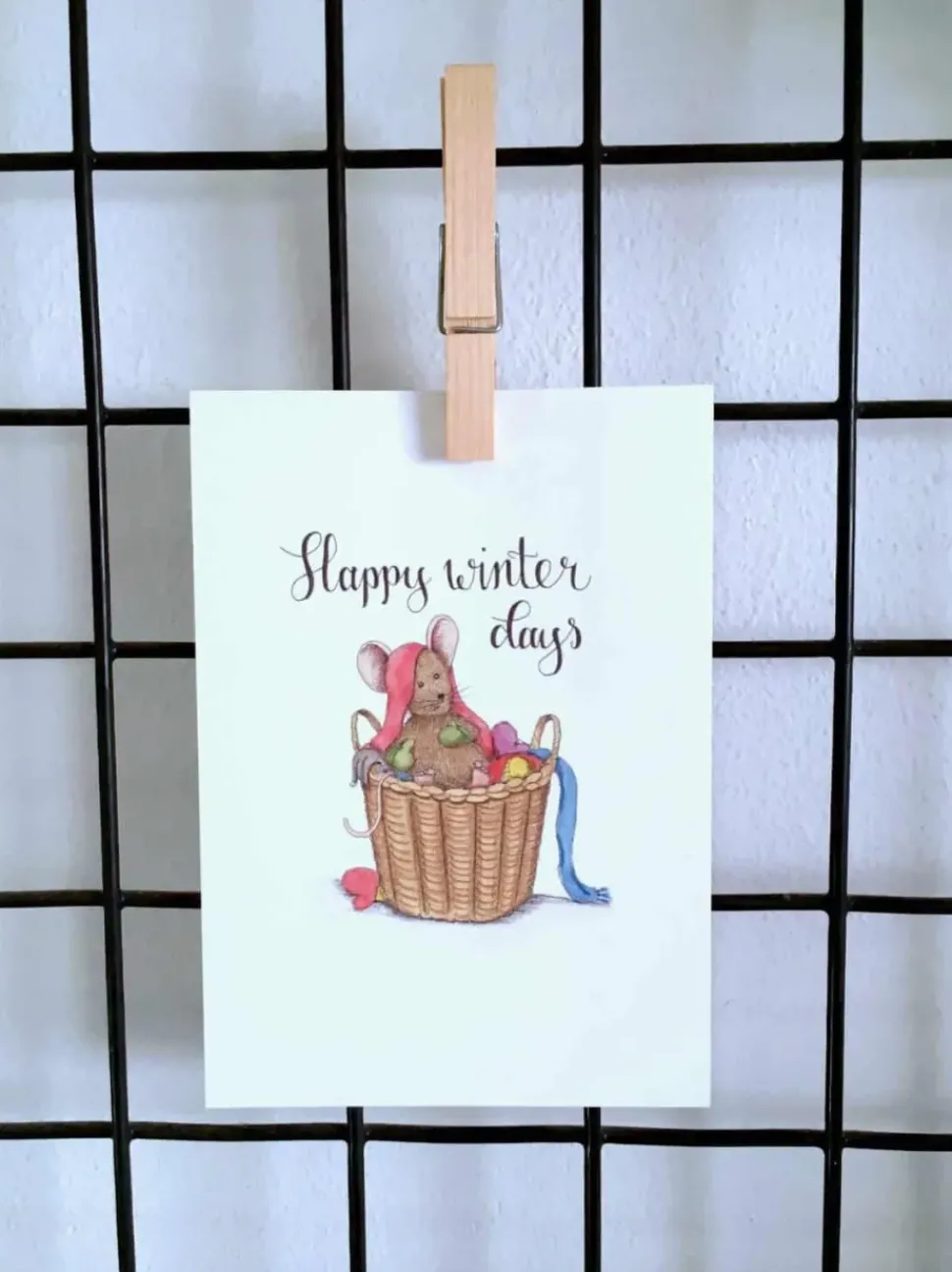 Anillustration Ansichtkaart Muisje in mand winterkleding