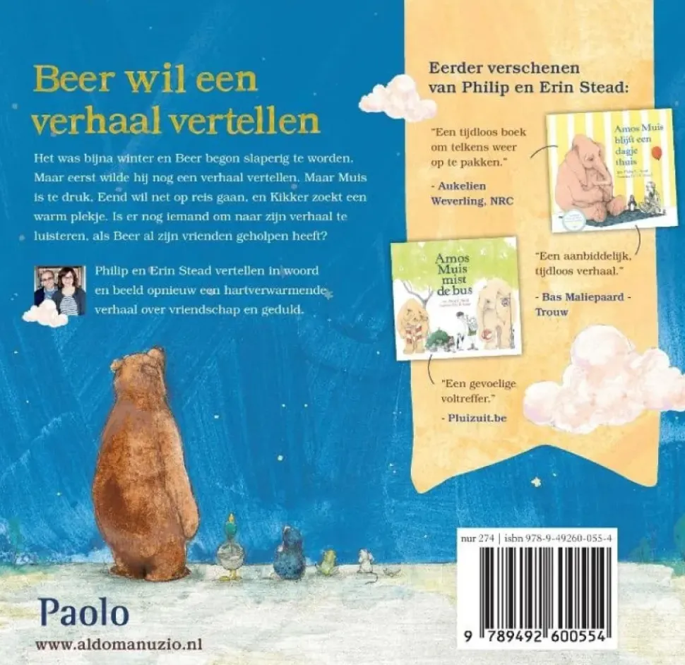 Het was bijna winter en Beer begon slaperig te worden. Maar eerst wilde hij nog een verhaal vertellen. Maar Muis is te druk, Eend wil net op reis gaan, en Kikker zoekt een warm plekje.