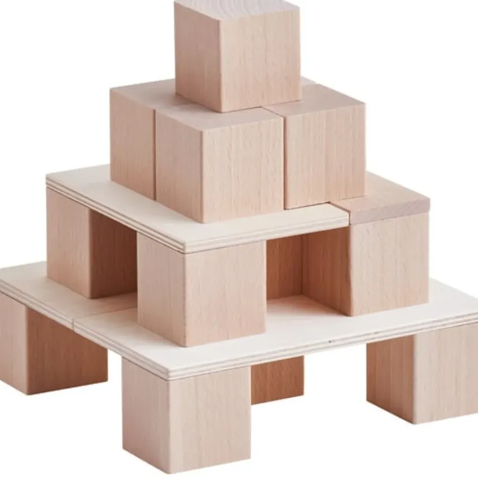 Deze bouwstenen zijn ideaal voor eerste bouwwerken. De kubus vormt het basiselement en wordt aangevuld met panelen en lijsten. Wie bouwt tunnels, deuren of zelfs bruggen? Al jong verkennen bouwmeesters de bouwstenen, leggen ze in rijen en stapelen ze op e