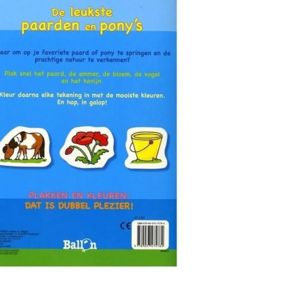 Klaar om op je favoriete paard of pony te springen en de prachtige natuur te verkennen? Plak snel het paard, de emmer, de bloem, de vogel en het konijn. Kleur daarna elke tekening in met de mooiste kleuren. En hop, in galop! Plakken en kleuren is dubbel p