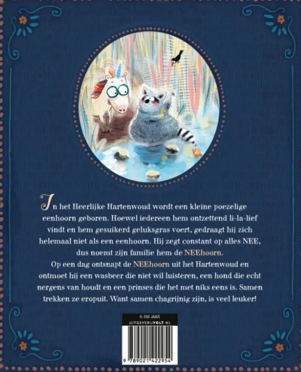 Hij zegt constant op alles NEE, dus noemt zijn familie hem de NEEhoorn. Op een dag ontsnapt de NEEhoorn uit het Hartenwoud en ontmoet hij een wasbeer die niet wil luisteren, een hond die echt nergens van houdt en een prinses die het met niks eens is. Samen trekken ze eropuit. Want samen chagrijnig zijn, is veel leuker!