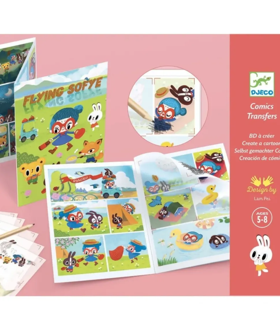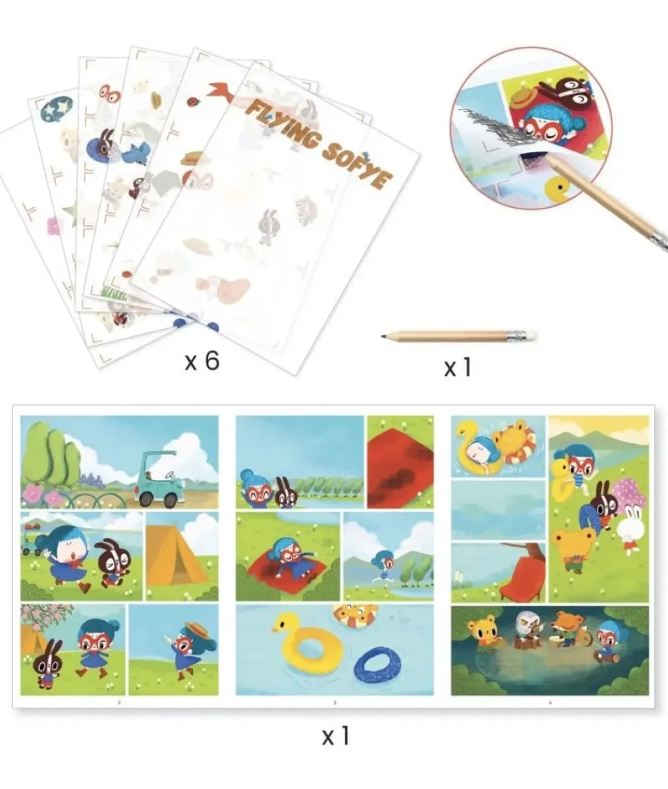 Met dit boekje kunnen kinderen een stripverhaal met grappige en aandoenlijke personages maken met behulp van plakplaatjes: ze wrijven met het potlood over de afbeeldingen en de afbeeld wordt overgezet op de achtergrond.