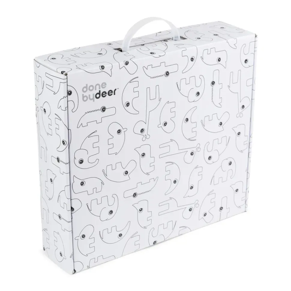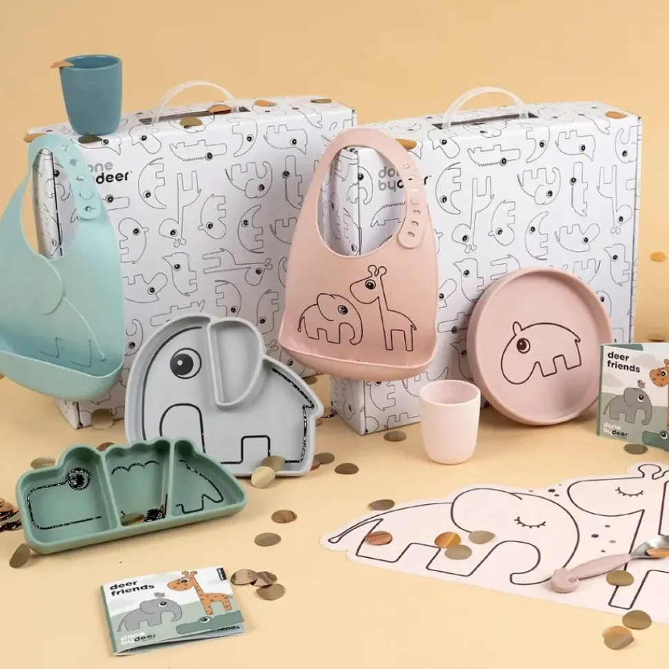 De Stick & Stay goodie box bevat een mix van vier bestsellers van de Done by Deer serviescollectie. De set bestaat uit: een Silicone Stick & Stay plaat met Elphee, een Silicone Stick & Stay snackbord met Croco, een Peekaboo slabbetje en een Silicone mini