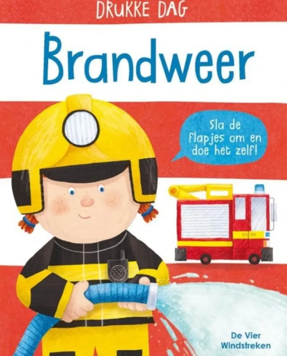 Pfoe! Wat een drukke dag. Help de brandweervrouw als ze langs de paal naar beneden glijdt, de brandslang uitrolt en het vuur blust. Door de interactieve flappen doe je zelf mee! Leer beroepen kennen, oefen de motoriek.