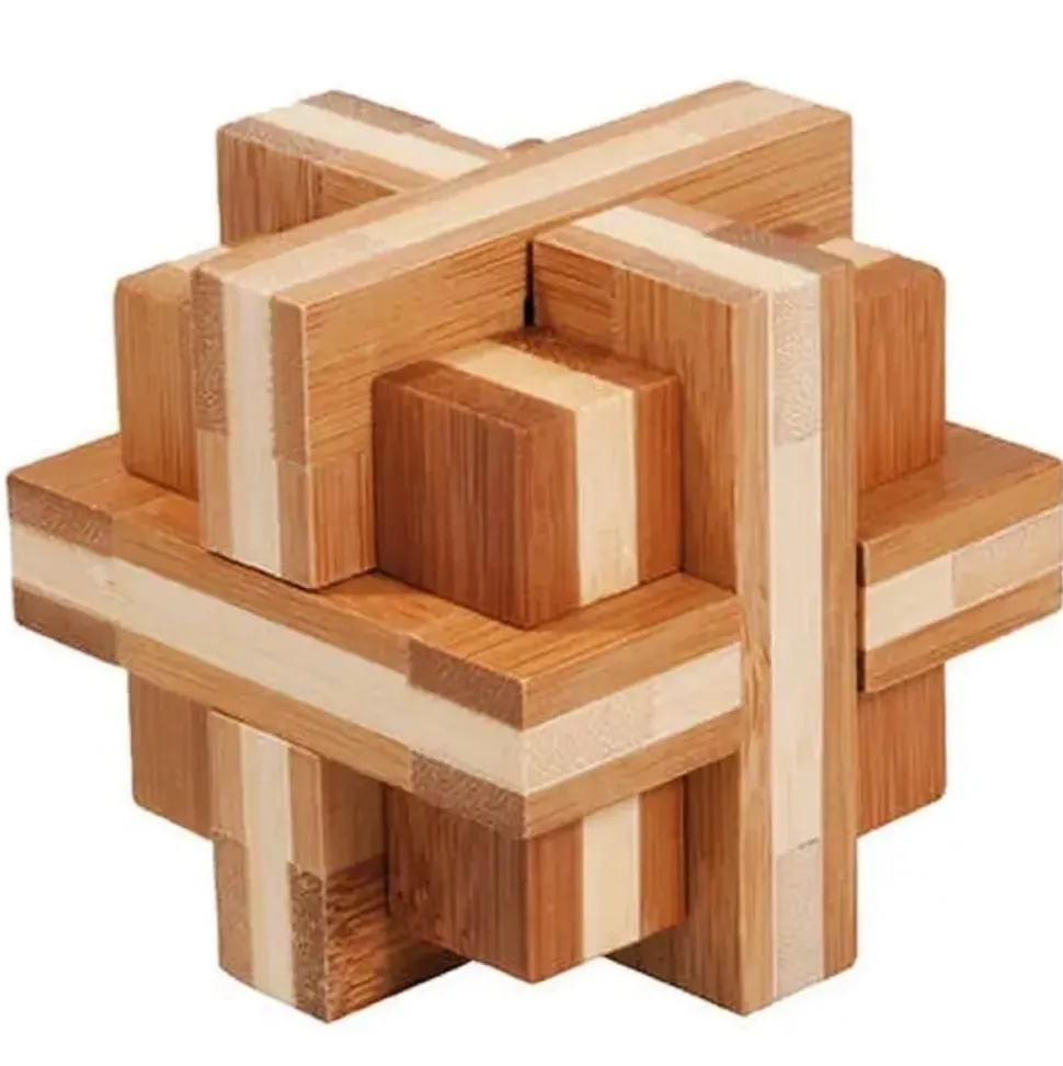 IQ-test, 3D-puzzel van bamboe, doos "dubbel kruis": 9x9x8 cm, moeilijkheidsgraad: 5 van de 5