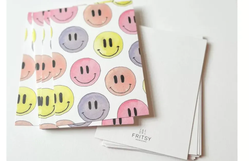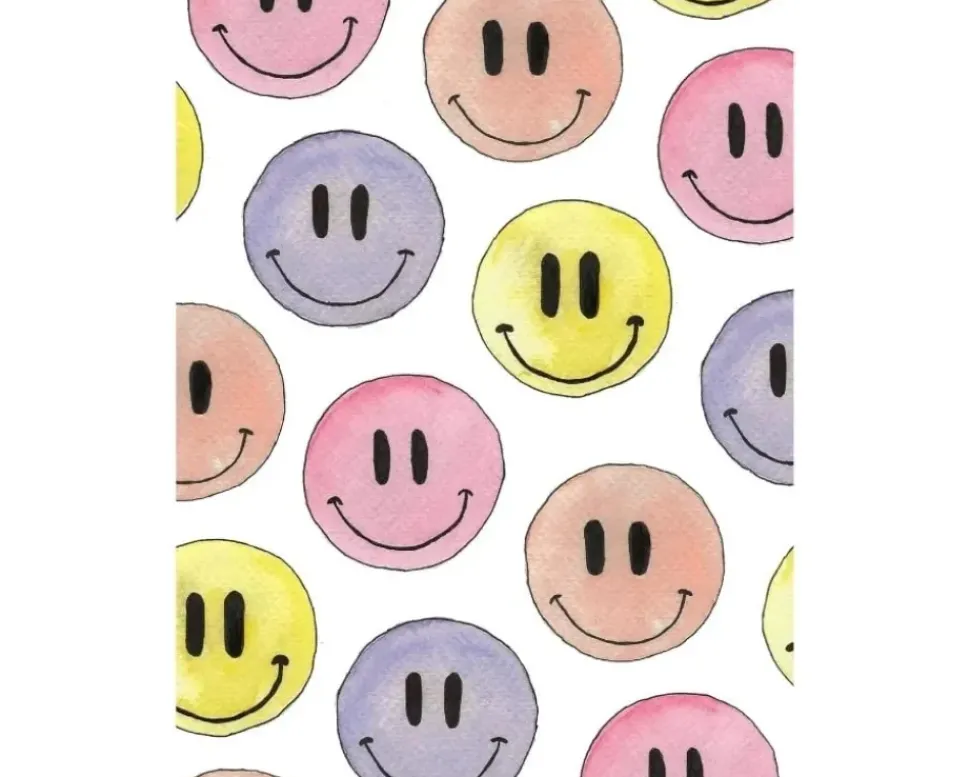 Kaart met een print van smileys, geschilderd met waterverf. De kaart is gedrukt op mooi stevig papier, dus je kan het ook neerzetten ter decoratie.