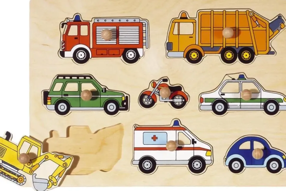 Op deze knoppuzzel van Goki vind je verschillende voertuigen, een brandweerauto, een vuilniswagen en nog meer voertuigen die je in het verkeer kunt tegenkomen. Door de grote knoppen geschikt voor de kleine vingers. Afmeting: 30×21 cm.