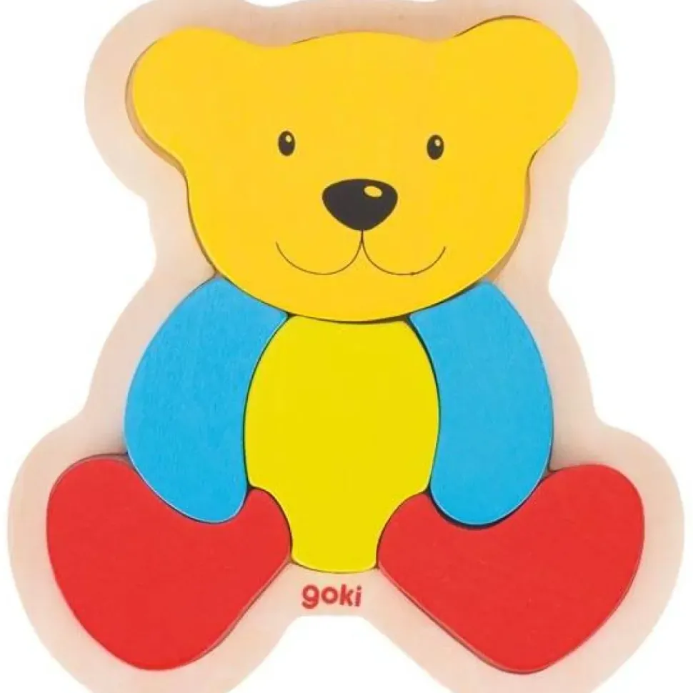 Leg de 6 stukjes van deze inlegpuzzel beer van Goki in de juiste volgorde en dan zie je een bont gekleurde beer te voorschijn komen.