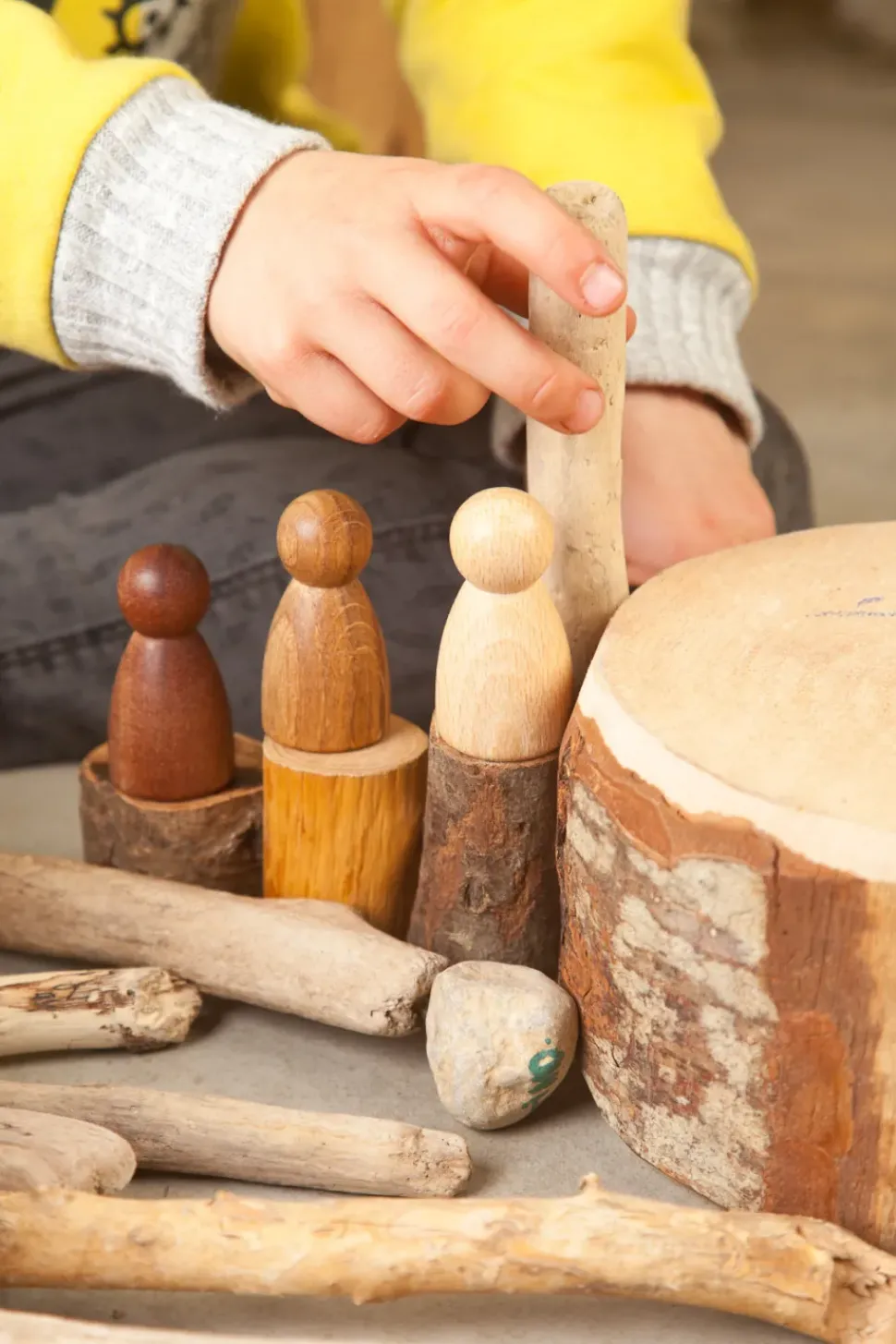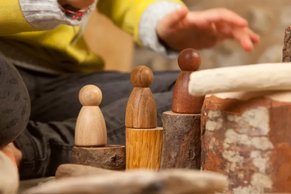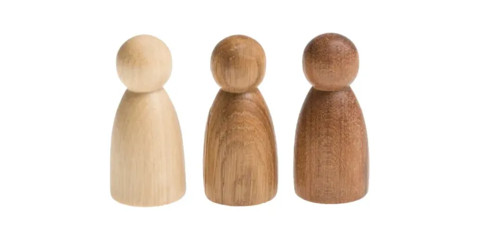 3 houten Nins of poppetjes van Grapat in drie verschillende houtsoorten: beuken, eiken en sapeli.