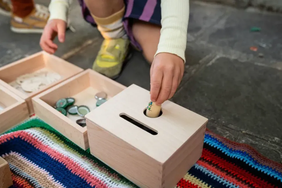 The box is thought to form knowledge around the principle of permanence, but it’s a great addition to symbolic play all the way to fitting, classifying, colour-matching and… endless more possibilities for you to discover!