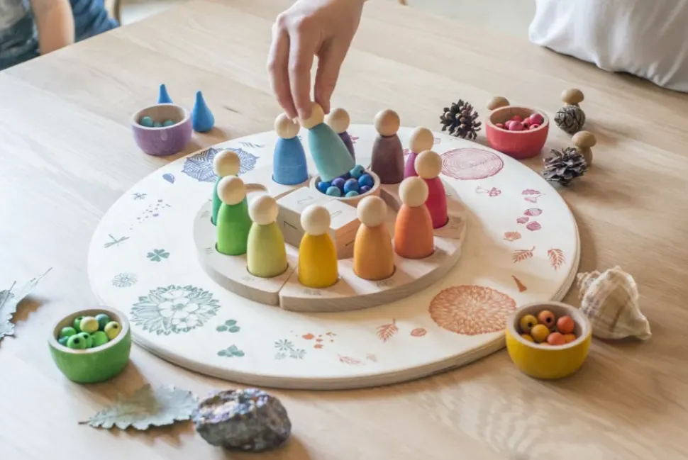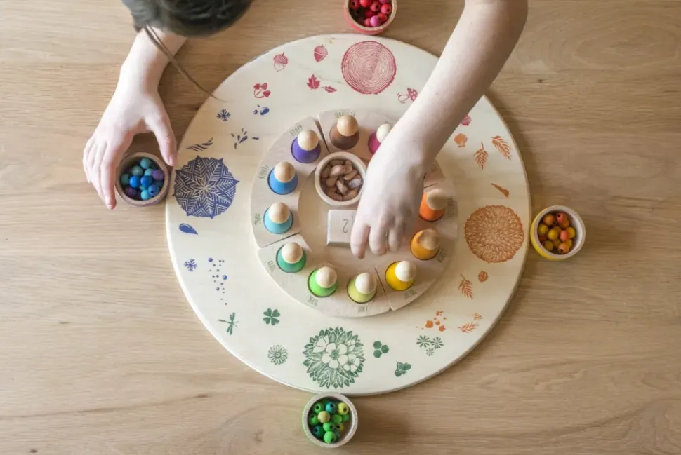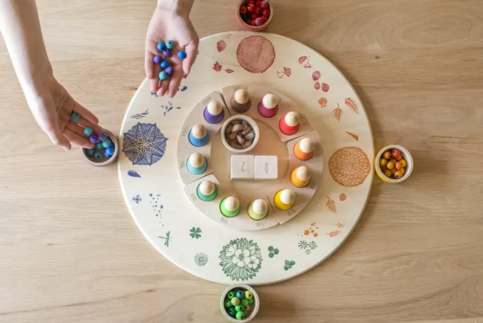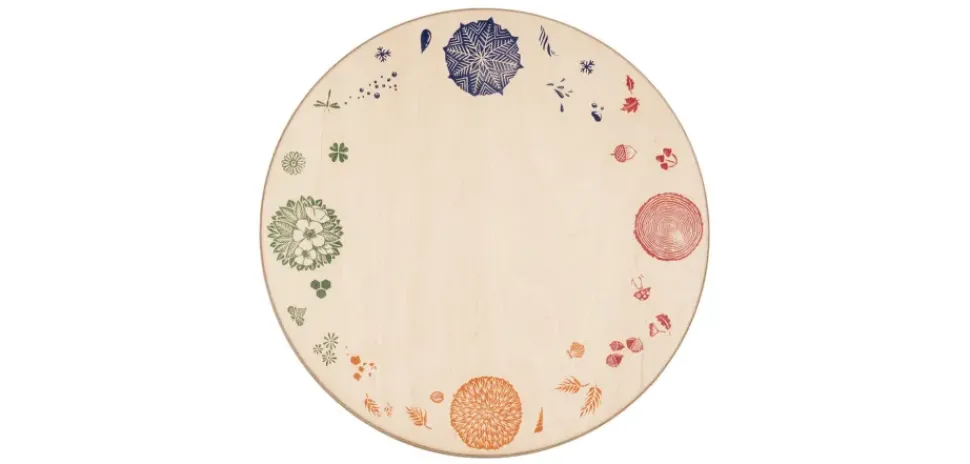 Rond houten platform met 4 natuurelementen en 4 seizoenen, handgemaakt gestempeld. Het kan een aanvulling zijn op de eeuwigdurende kalender. De klok is tegengesteld.