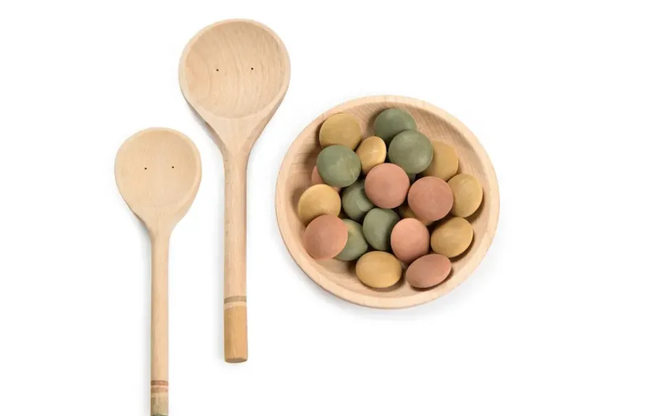 Een set bestaande uit een bord, twee lepels en 24 stuks lekker eten. Het is een geweldige aanvulling op symbolisch spel, maar vanwege het open karakter kan het alles worden waar kinderen naar verlangen. Afmeting Bord 12.5 cm