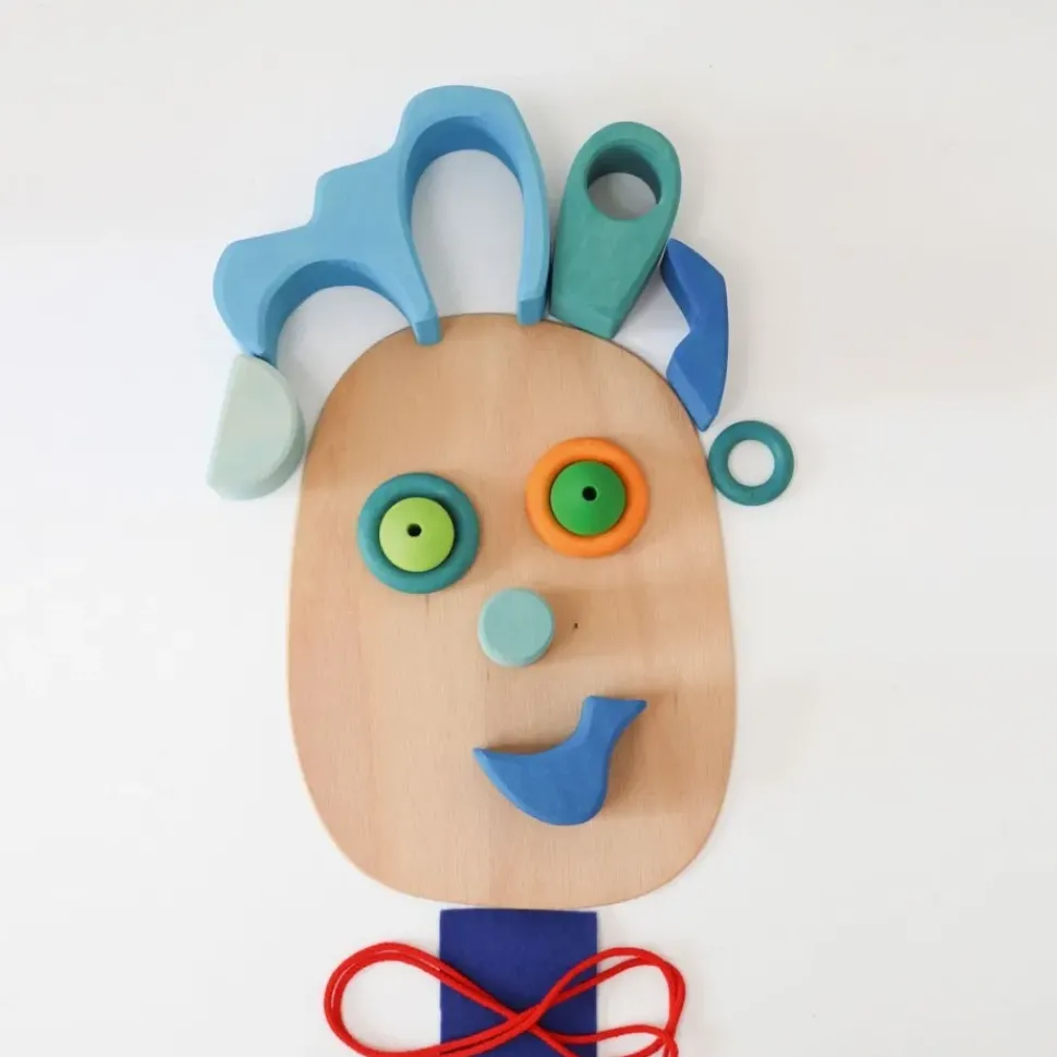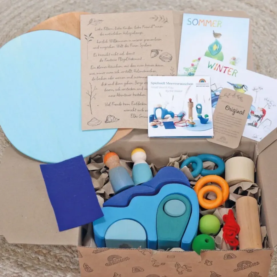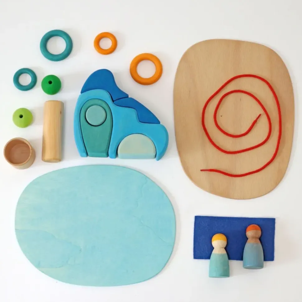 Deze houten set van Grimm's komt uit de speelwereld serie. De set bestaat uit 2 houten vrienden, 1 rol, 4 ringen, 2 parels, 1 schaaltje, 2 platen, 1 snoer en een stukje vilt.