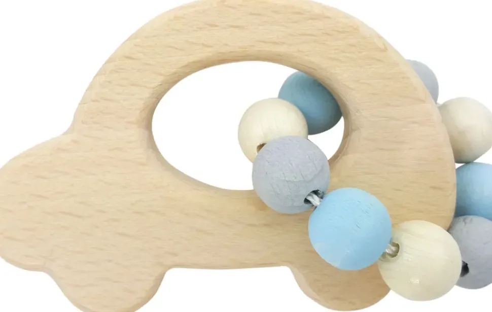 Deze grijpfiguur van Hess is hoogwaardig afgewerkt. Deze rammelaar in de vorm van een auto heeft blauw gekleurde balletjes aan een koord, daar kunnen ze lekker mee rammelen.