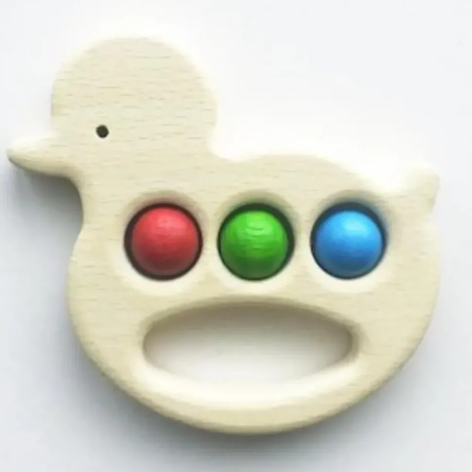 Deze grijpfiguur van Hess is hoogwaardig afgewerkt. Deze rammelaar in de vorm van een eendje heeft kleurige balletjes in zich, daar kunnen ze lekker mee rammelen.