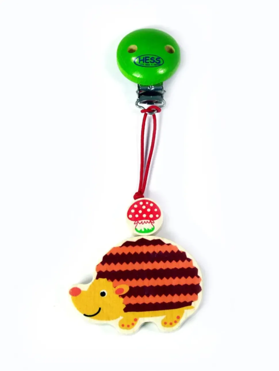 Dit houten clipfiguurtje van Hess kun je gemakkelijk bevestigen aan de kinderwagen, box en bed of aan de kleding. Deze kinderwagenhanger is in de vorm van een egel met een paddenstoel op zijn ruggetje.