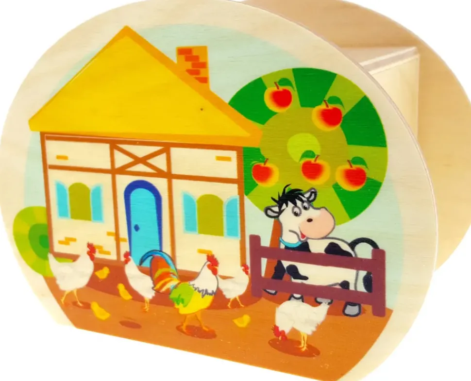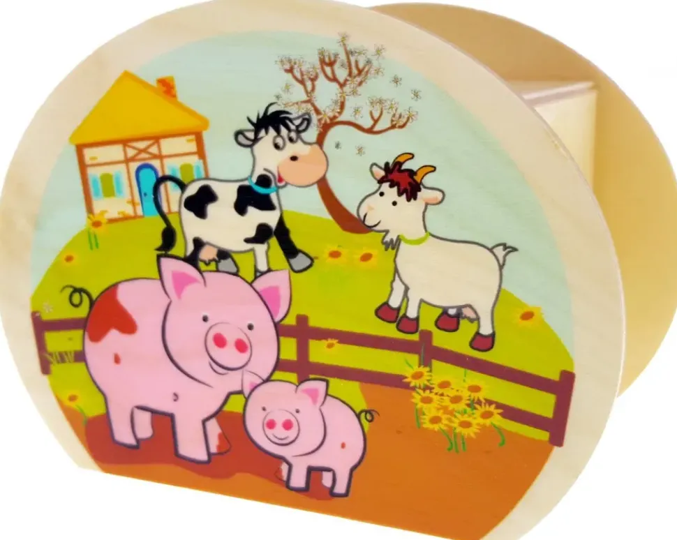 Een spaarpot die met de hand gemaakt is van hout. Deze spaarpot van Hess heeft aan beide zijden afbeeldingen van dieren die in en rond de boerderij voorkomen zoals een varken, koe en geit. Leuk om te geven of te ontvangen.