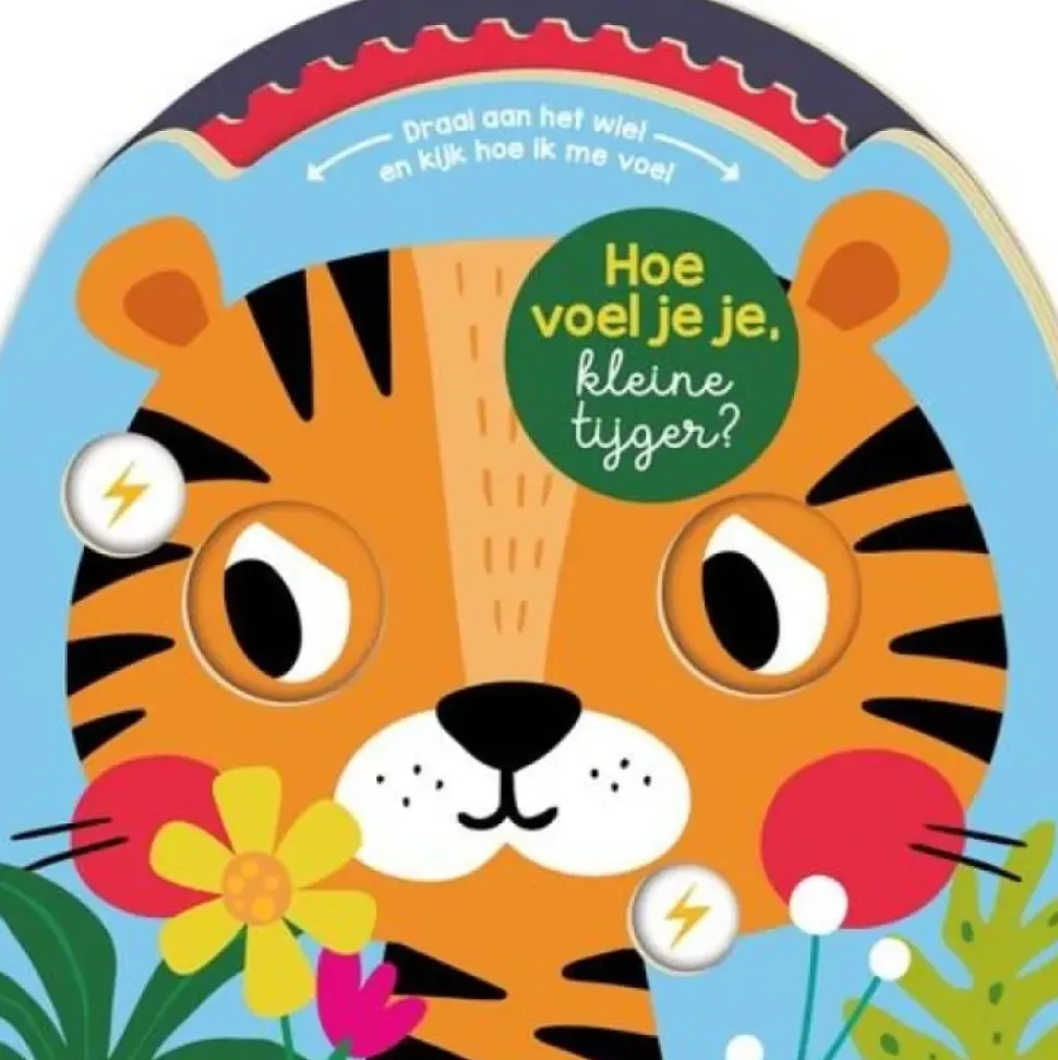 Draai aan het wiel en kijk hoe ik me voel! Kijk naar Tijger! Hoe voelt hij zich? Is hij blij, verdrietig, bang of misschien slaperig? Als je aan het wiel draait, veranderen de ogen van kleine tijger. In welke stemming is hij nu? Extra leuk is het klik-kli