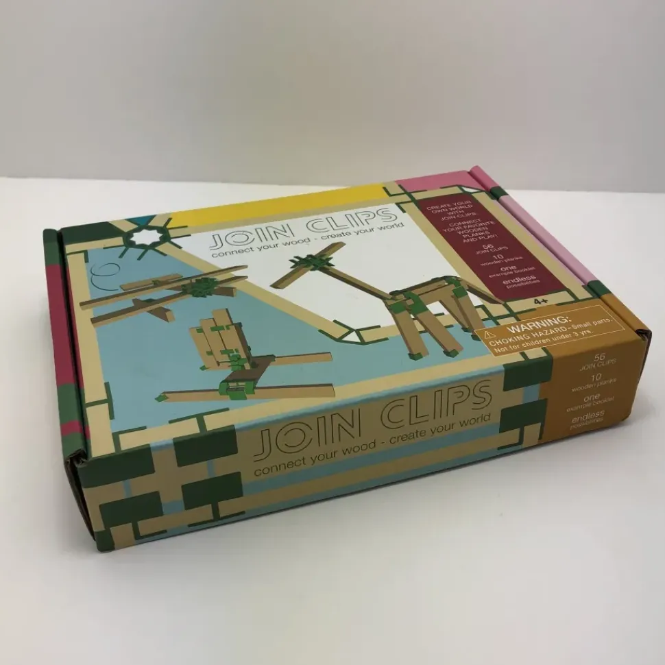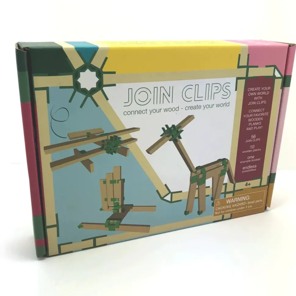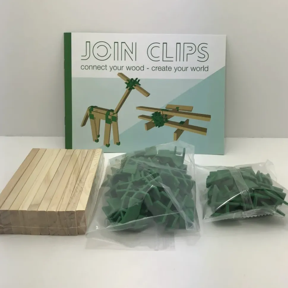 Dit is de mini set van JOIN CLIPS. Met deze basisset die bestaat uit slim gevormde verbindingselementen en houten plankjes kun je van alles maken; zoals vliegtuigen, dieren, figuren of boten.