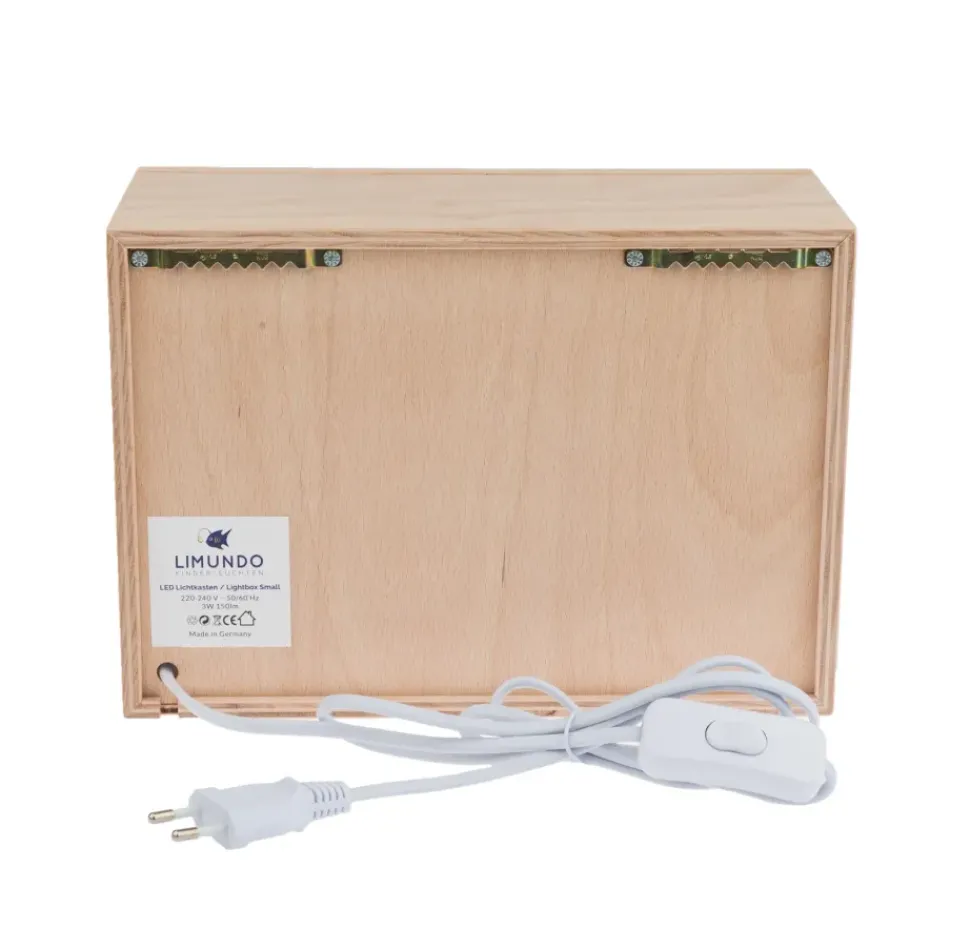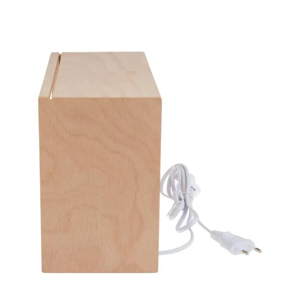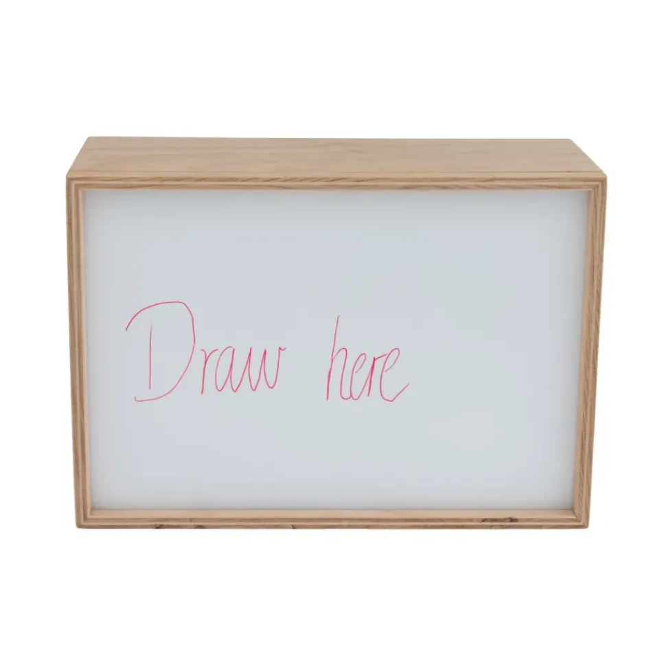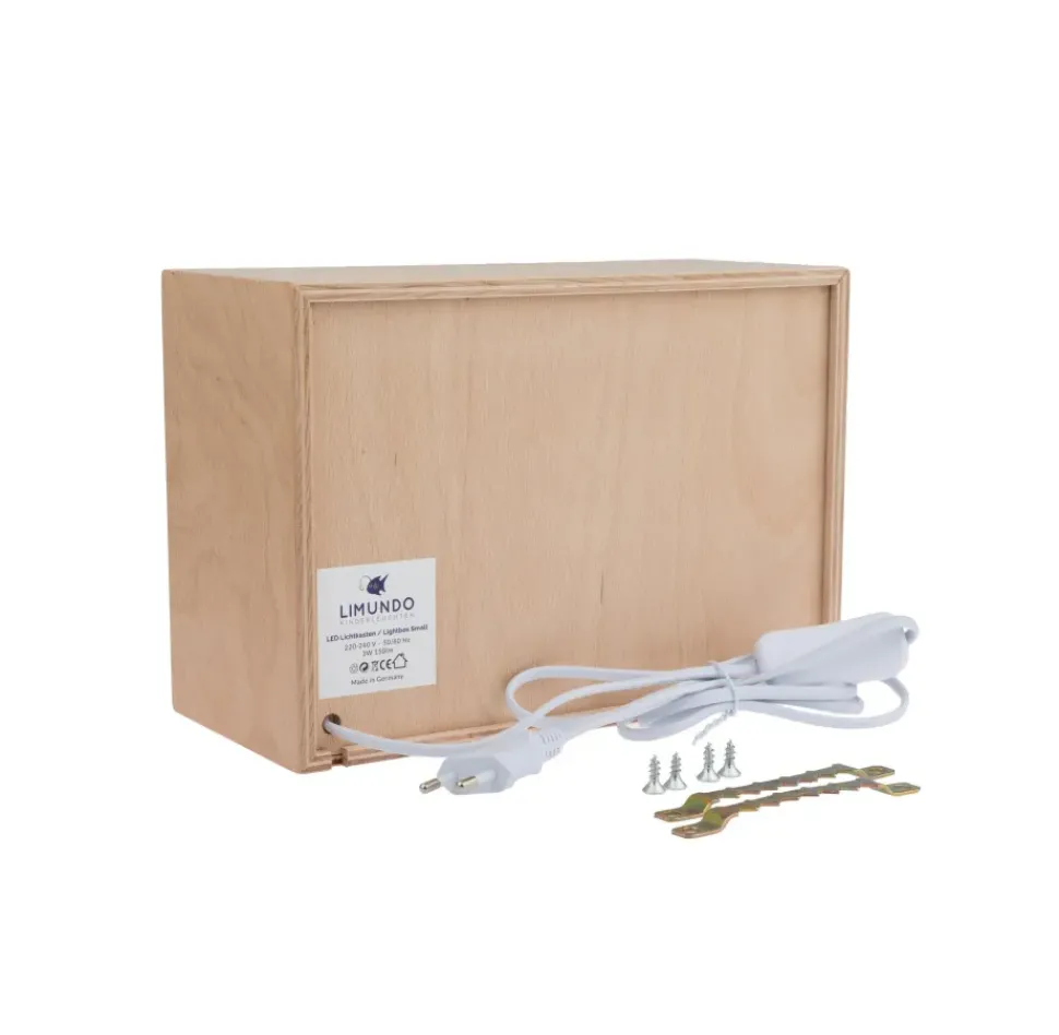 Een mooie rechthoekige houten wandlamp van Limundo. Uniek aan deze wandlamp is het verwisselbare front. Deze heeft een motief waarop jezelf jouw eigen afbeelding kunt tekenen met een wateroplosbare viltstift. Wandmontage of losstaand is beide mogelijk.