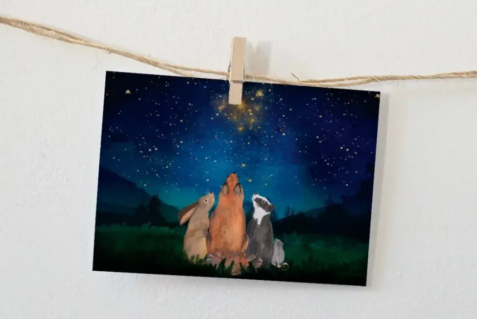 Sterren kijken! Een knusse originele illustratie die verstuurd kan worden met kerst of gewoon zomaar. Maar ook mooi voor aan de muur. Daarnaast kan je hem natuurlijk ook bij een cadeau stoppen. Altijd leuk om een kaartje te sturen of in huis op te hangen!