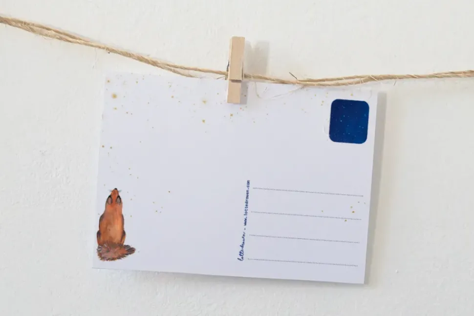 De illustratie van de kaarten van Lotte Drouen zijn door haar persoonlijk met de hand getekend en worden in kleine oplages gedrukt op mooi en dik structuurpapier. Het is zo net een klein schilderijtje. Ook de achterkant van de kaart heeft een mooi ontwerp met kleurrijke lijntjes voor de naam, adres, woonplaats en postzegel en natuurlijk ook nog een leuke illustratie.
