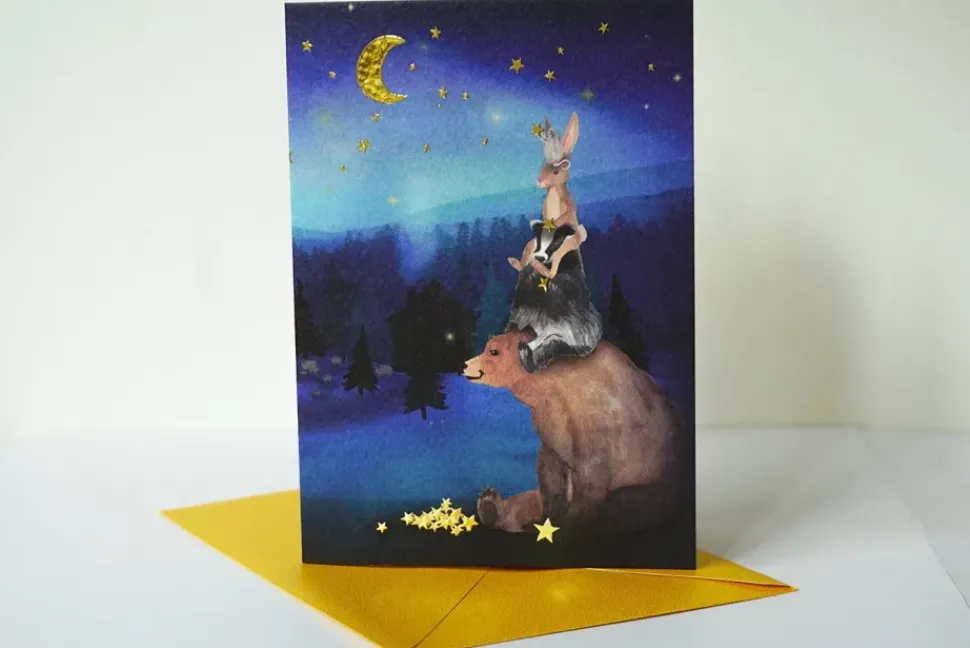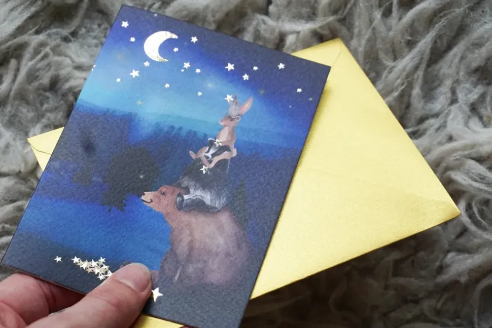 De illustratie van de kaarten van Lotte Drouen zijn door haar persoonlijk met de hand getekend en worden in kleine oplages gedrukt op mooi en dik structuurpapier. Het is zo net een klein schilderijtje. De wenskaart (gevouwen kaart) heeft een doorlopende illustratie op de achterkant. Binnenin is er ruimte voor een tekst. De wenskaart komt met een mooie kraftenvelop waarin de kaart verstuurd kan worden.