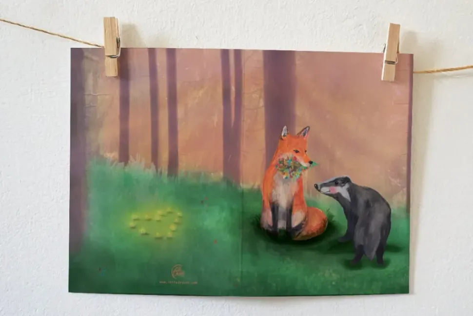 De liefde is om te vieren, zo vinden ook deze vos en das. Wil jij het ook vieren? Kies voor deze liefelijke wenskaart met een mooie orginele illustratie die verstuurd kan worden met dit bijzondere moment. Daarnaast kan je de kaart natuurlijk ook altijd in