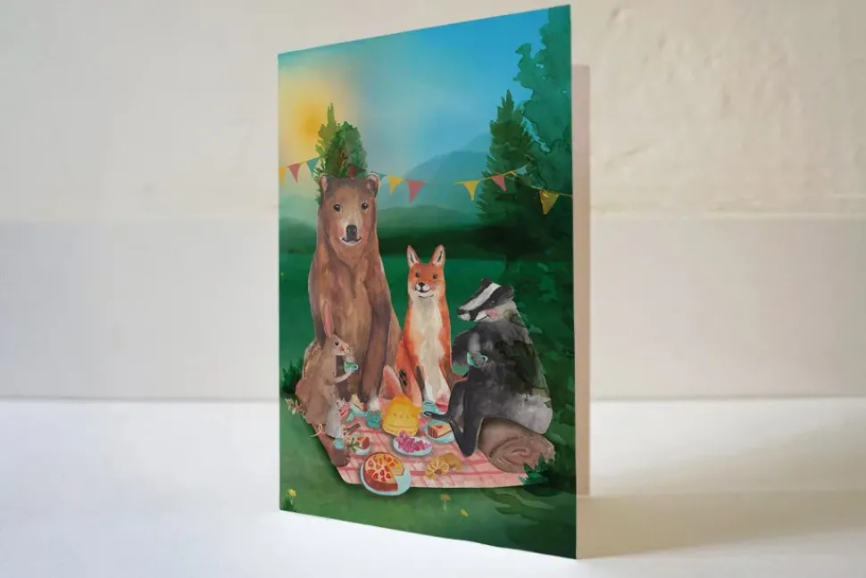 Lekker picknicken samen met bosdieren! Een betoverende wenskaart die het leven viert door aan te schuiven bij deze heerlijke picknick. Er is altijd wel een goede reden te bedenken om een mooi kaartje te sturen! Ook kan je de kaart natuurlijk in een lijstj