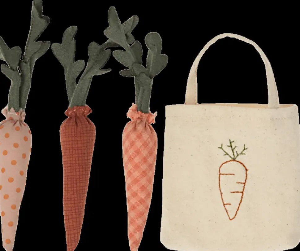 De favoriete snack van konijnen & konijnen. Dit zakje bevat drie worteltjes en is allemaal van Maileg stof. Een lief accessoire dat aanzet tot nog meer spelen
