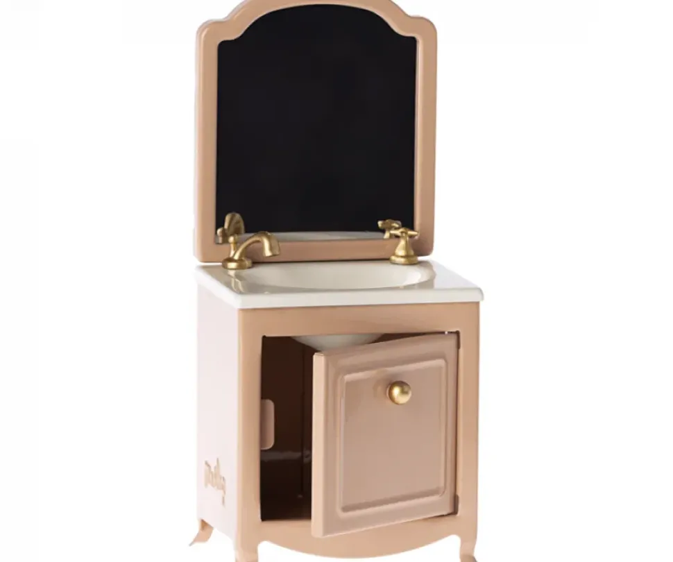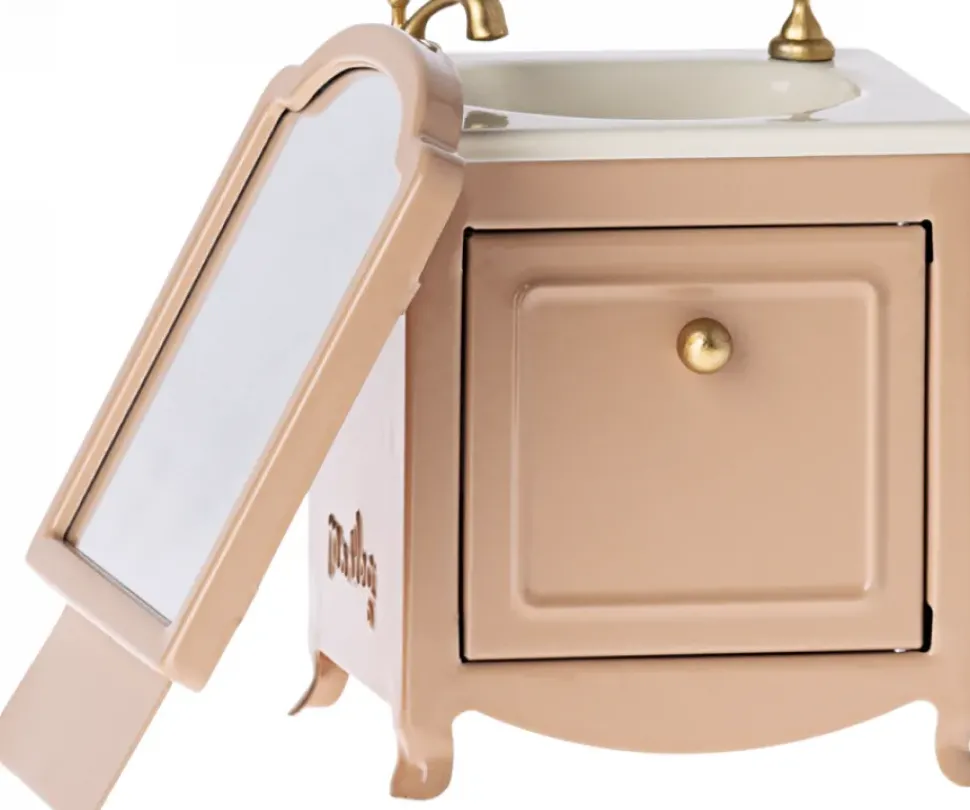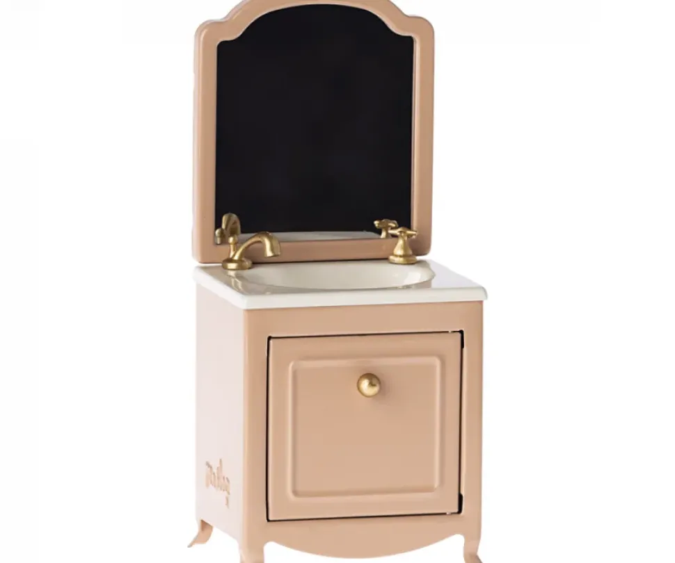 Een prachtig item voor de koninklijke badkamer in het Maileg muizenkasteel. Het heeft een kleine kast onder de gootsteen en natuurlijk ook een spiegel. Afmeting 6.5x15cm.