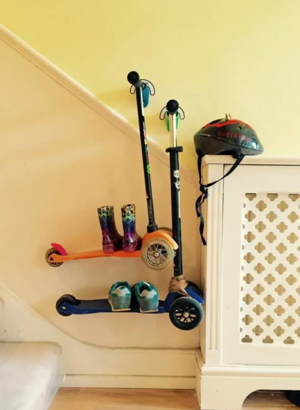 Een slimme haak waaraan je de Micro Step thuis op kunt hangen. Makkelijk te bevestigen. Zo staan de steps niet in de weg in de gang of schuur en blijft alles netjes opgeruimd. Geschikt voor kleine en grote 3 wielige steppen. De haak is grijsblauw gekleurd