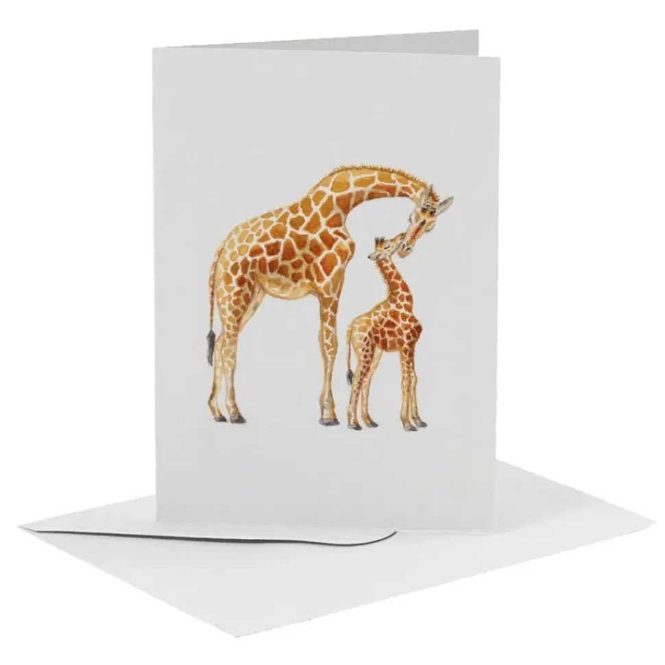 Een blanco wenskaart zonder tekst waarop een tweetal giraffen zijn afgebeeld. De schildering is gemaakt door Mies met aquarelverf. De kaart is gevouwen op A6 formaat, gedrukt op 350 grams gebroken wit papier en wordt inclusief witte envelop geleverd.