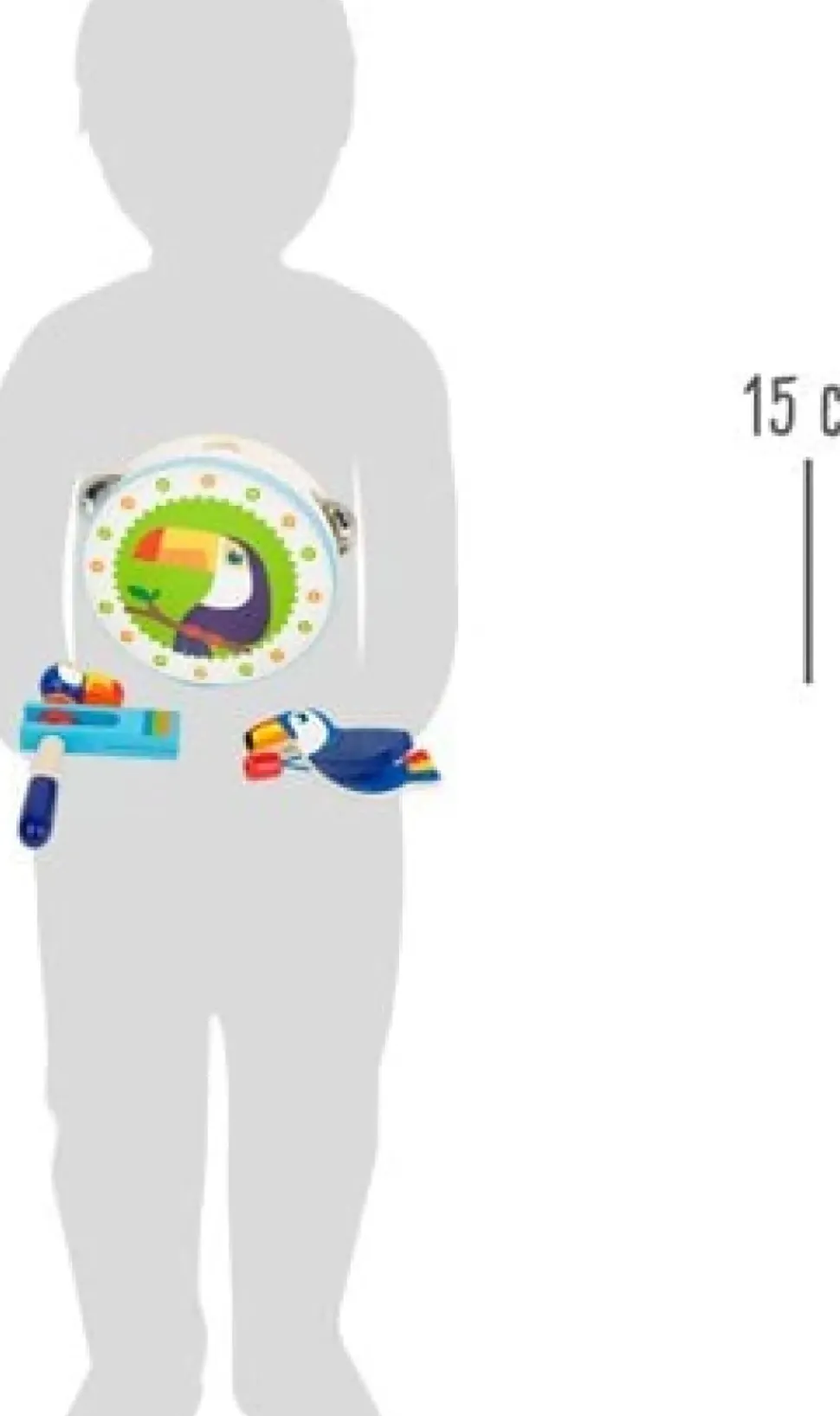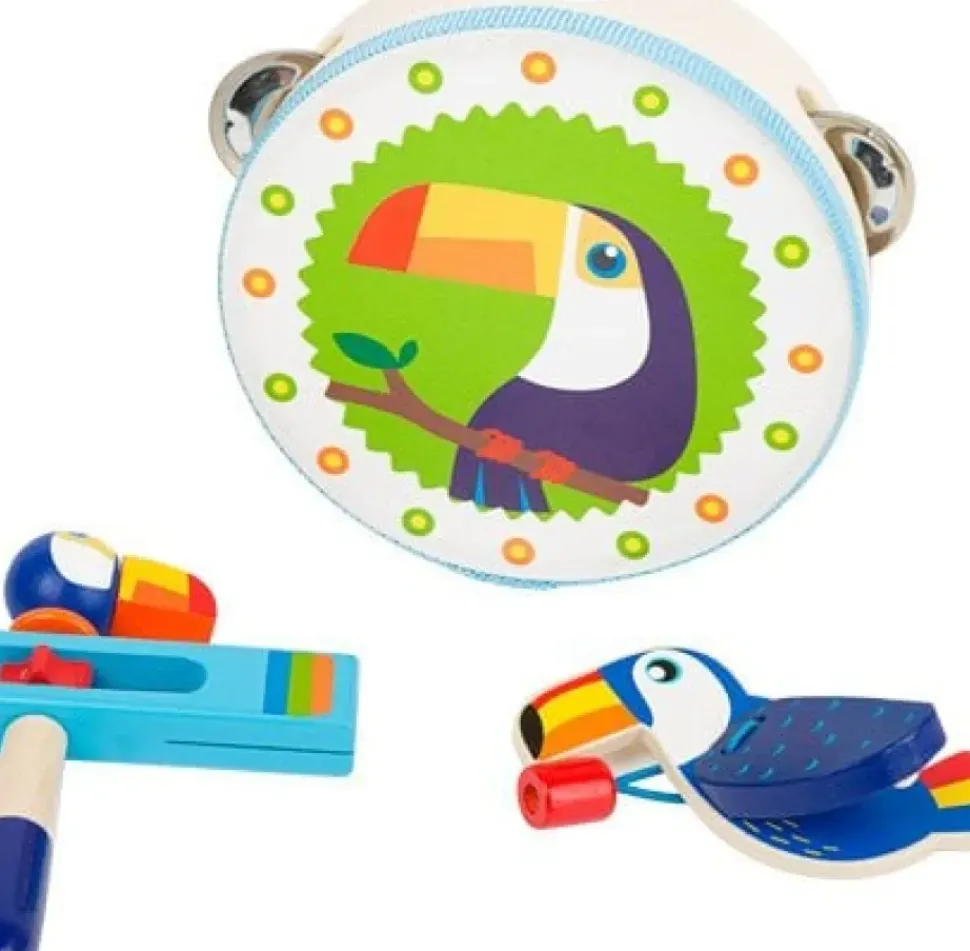 Met deze muziekset voorzien van leuk "toekan" motief kunnen ze heel veel instrumenten spelen of ze kunnen een kleine band beginnen. Deze set bestaat uit een ratel, een toekan klik klak en een tamboerijn.