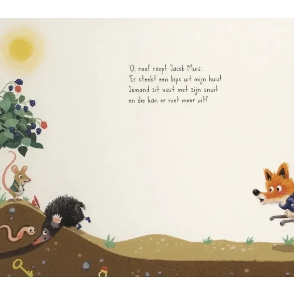 Uit het muizenhol steken billen en twee pootjes. En ze zijn niet van Muis! O-oh, Mol zit vast in het muizenhol!