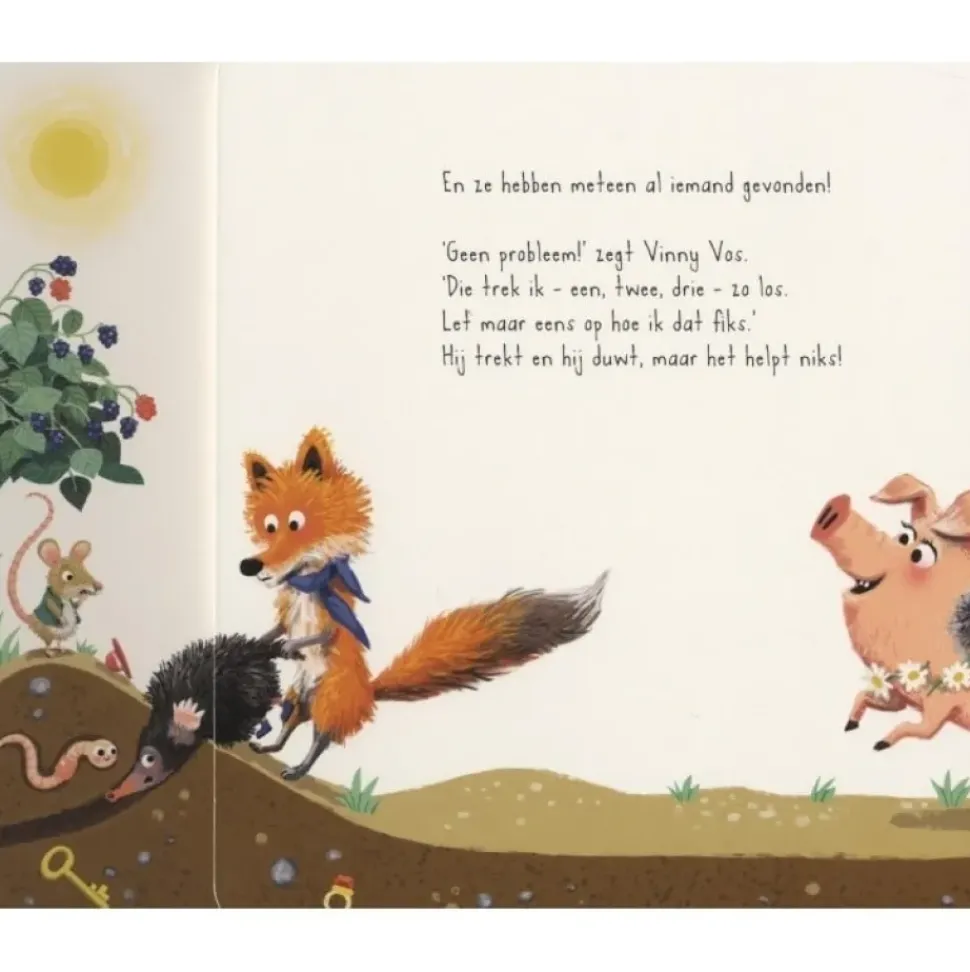 Eén voor één doen de dieren een poging hem te bevrijden. Maar in hun eentje lukt het niet. En als ze nu een lange rij maken, en allemaal tegelijk trekken, zou Mol dan eindelijk los schieten?