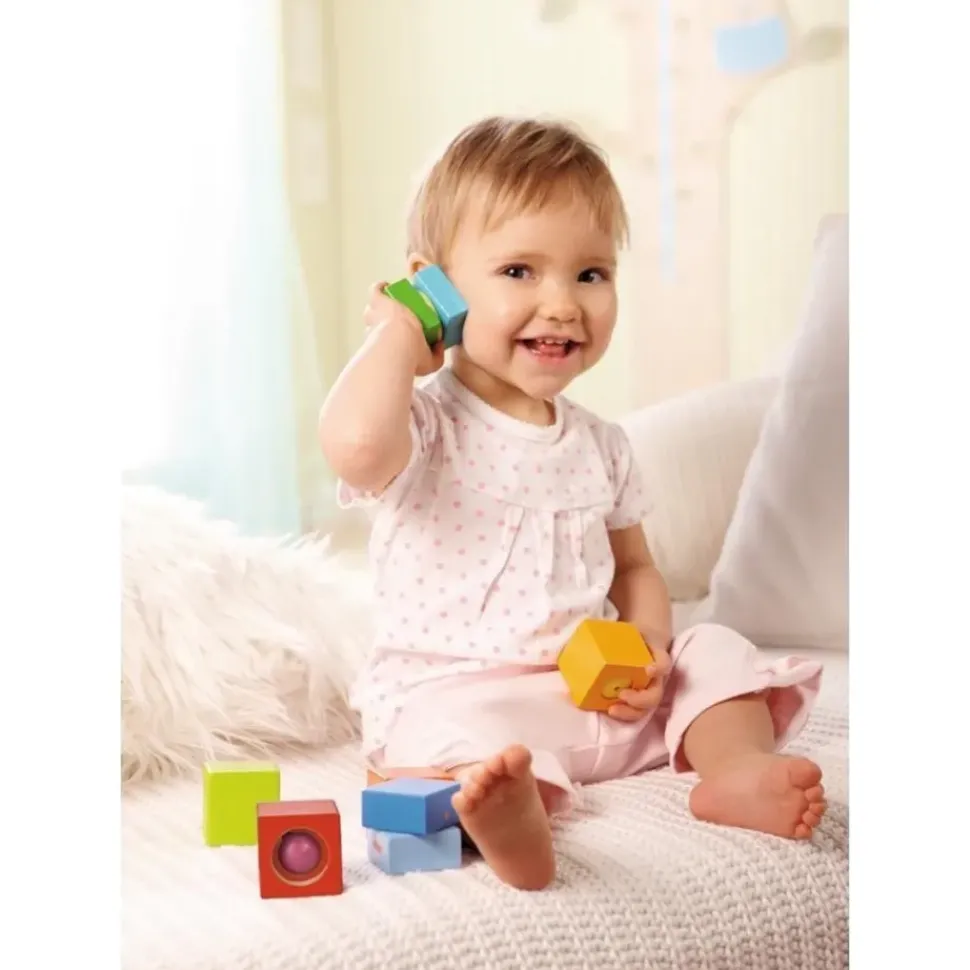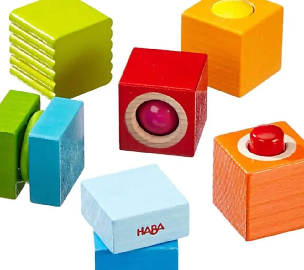 Spits je oren, want hier zijn heel veel verschillende geluiden te horen. Piepen, rammelen, bellen, ratelen… elk blok heeft een ander akoestisch effect in voorraad. Kleine klankenonderzoekers komen tijdens het spelen met de ontdekkingsstenen helemaal aan
