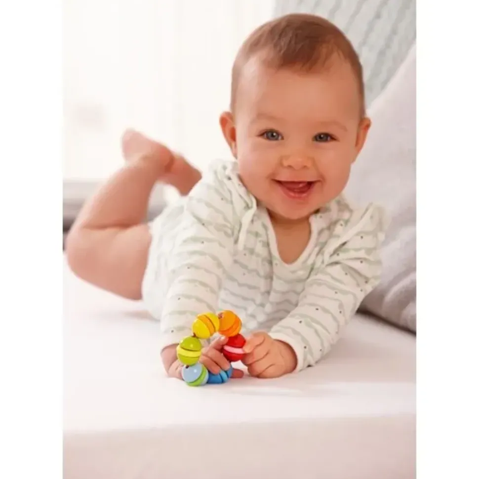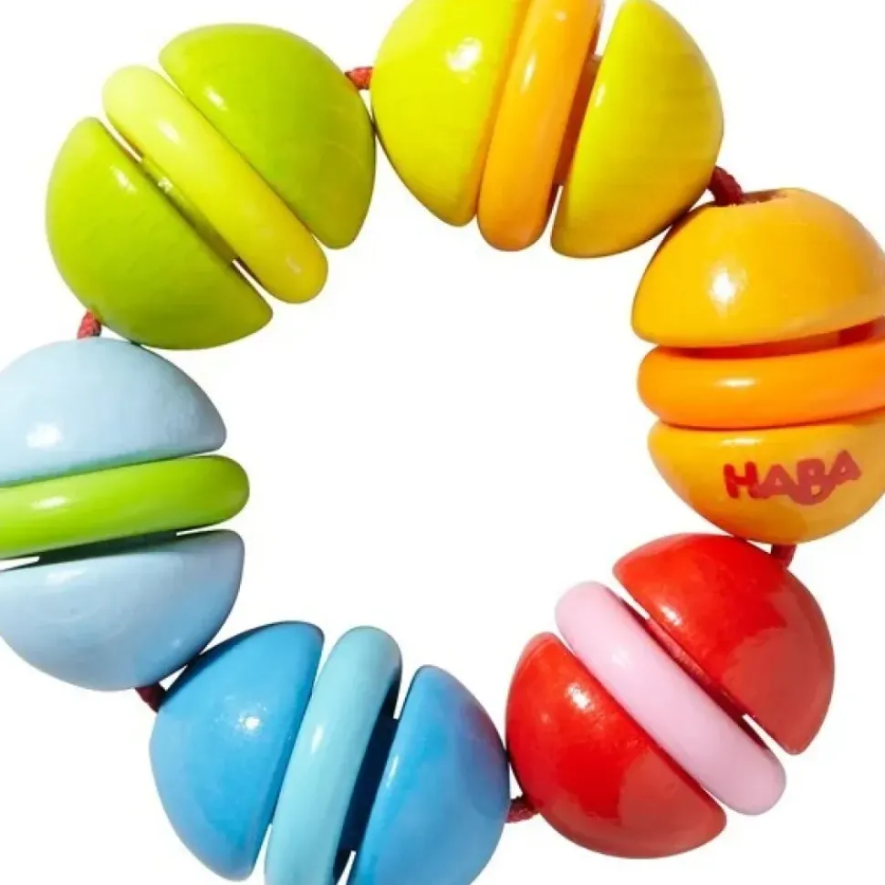 Deze robuuste houten rammelaar fascineert baby’s door zijn kleurrijke kunststof ringen, die bij het schudden vrolijk klepperen.