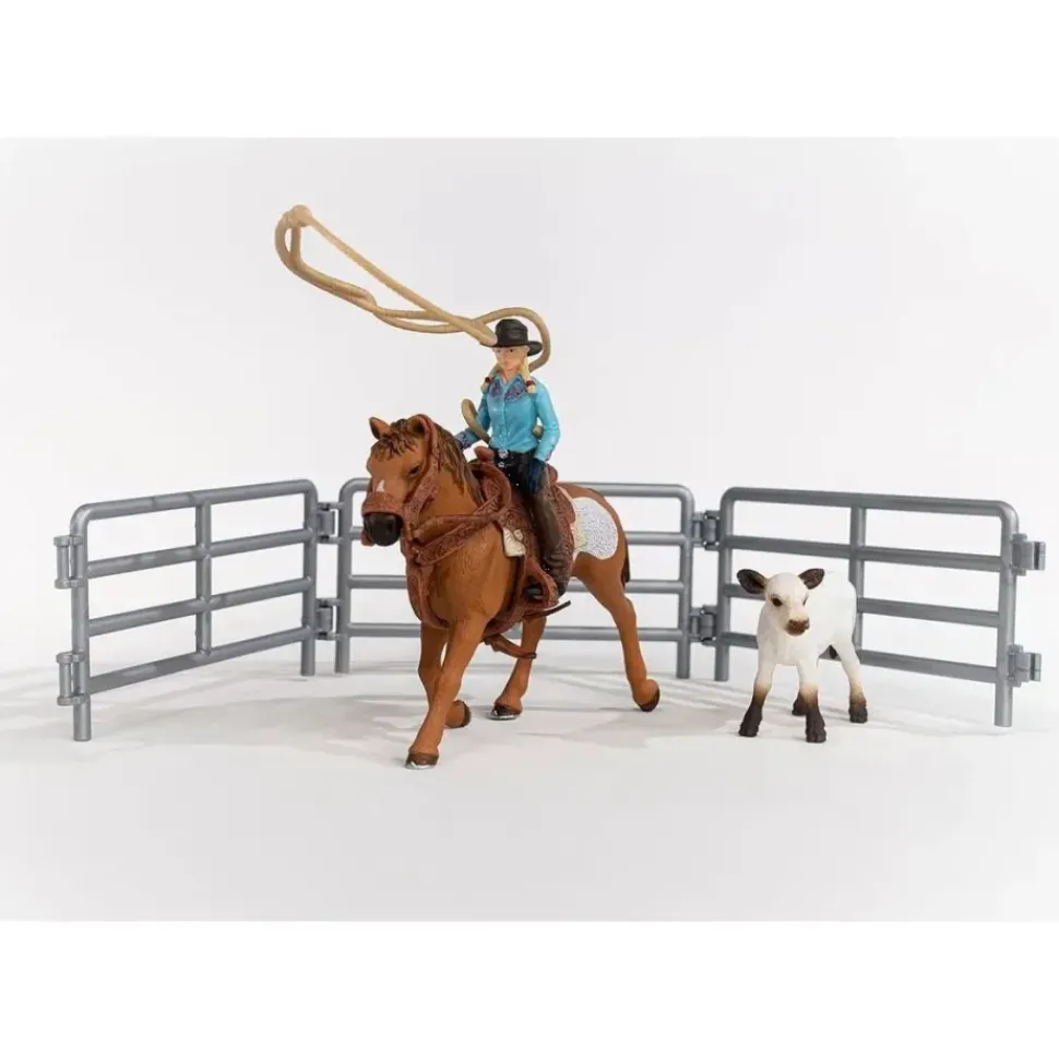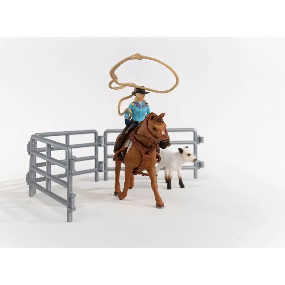 Ook koeien moeten weleens naar de dokter. En dan is er ‘team roping’ van Schleich® Farm World nodig om de patiënt te vangen. De beste methode hiervoor is om met de lasso op de achterpoten of de nek te mikken.