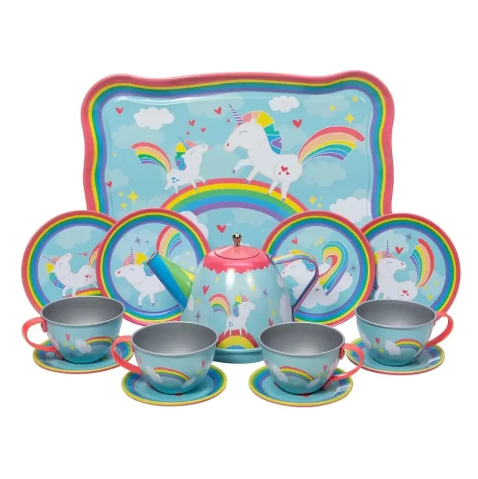 Tijd voor thee! Deze speelse eenhoorn-tinnen speelgoed-theeset zit boordevol theekopjes, borden, een theepot en meer, allemaal versierd met een kleurrijk eenhoornontwerp. Organiseer theekransjes met vrienden, knuffels en poppen.