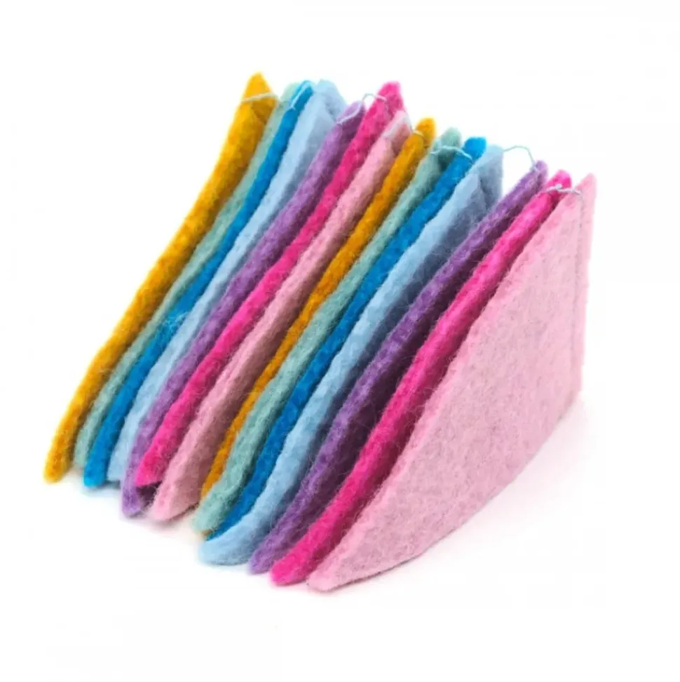 Slinger met vilten vlaggetjes in pasteltinten. Heel leuk voor een verjaardag, maar ook als decoratie in elk interieur! De viltslingers van Sjaalmetverhaal worden met de hand gevilt door vrouwen in Nepal.