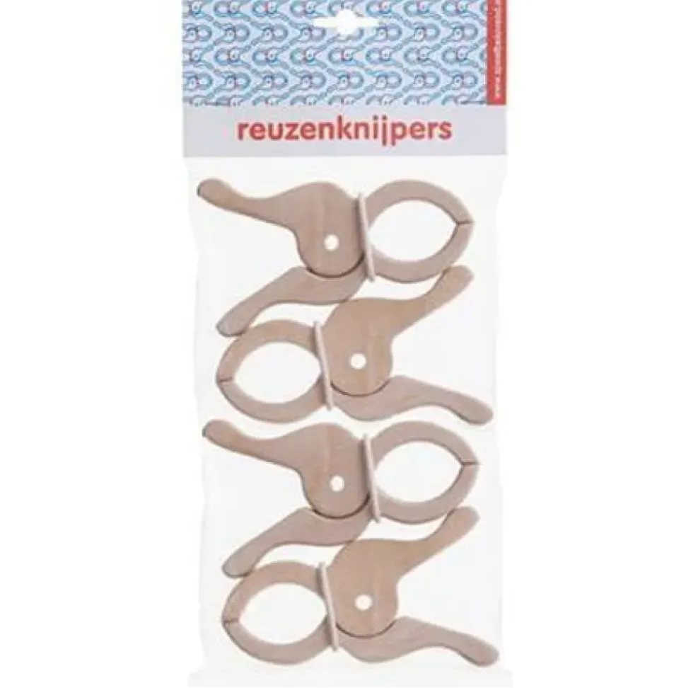 Onmisbaar als je jouw eigen tent of hut wilt gaan bouwen: de reuzenknijpers van Speelbelovend. Om een mooie hut te maken heb je vier van deze houten knijpers nodig. Je koopt de set van 4 stuks. Afmeting: 13.5 x 5.5 x 1.8 cm.