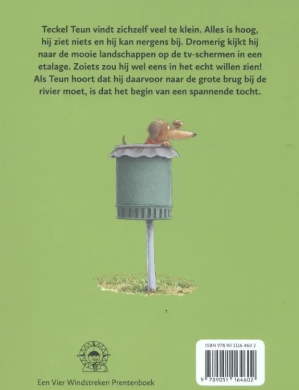 Teckel Teun vindt zichzelf veel te klein. Alles is hoog, hij ziet niets en hij kan nergens bij. Dromerig kijkt hij naar de mooie uitzichten op de tv's in een etalage. Die zou hij wel eens in het echt willen zien! Als Teun hoort dat hij daarvoor naar de gr