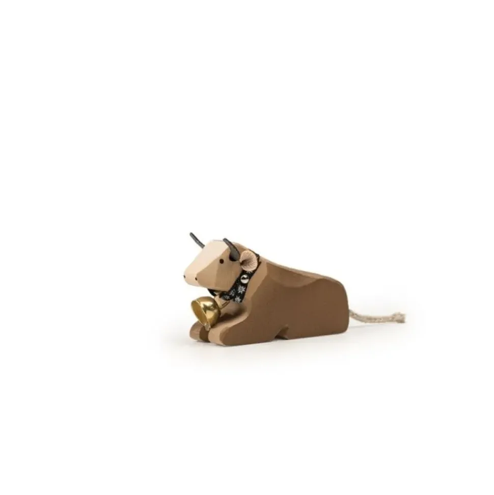 Deze bruine koe nummer 1 van Trauffer ligt en heeft zijn kop omhoog gericht. De koe is 10x5x3 cm groot. Deze bruinvee koe is handgemaakt in Zwitserland.