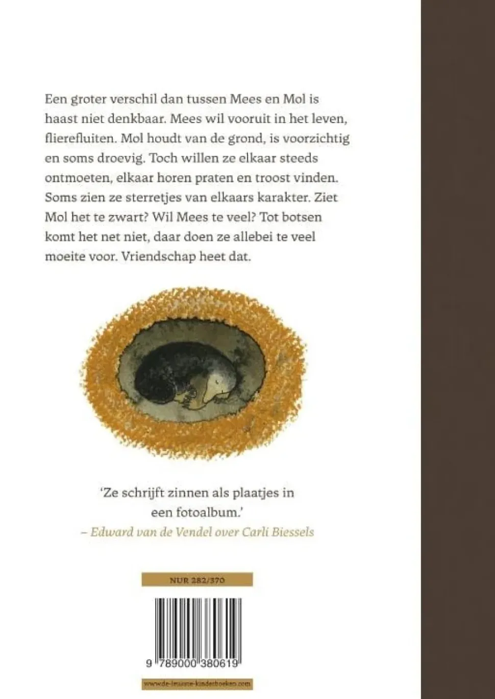 wil vooruit in het leven, flierefluiten. Mol houdt van de grond, is voorzichtig en soms droevig. Toch willen ze elkaar steeds ontmoeten, elkaar horen praten en troost vinden bij elkaar. Soms zien ze sterretjes van elkaars karakter. Ziet Mol het te zwart? Wil Mees te veel? Tot botsen komt het net niet, daar doen ze allebei te veel moeite voor. Vriendschap heet dat.Tussen Mees en Molis een prachtige bundel met korte verhalen over een wonderlijke vriendschap. Deze luxe-editie is het ideale cadeau voor jong en oud.