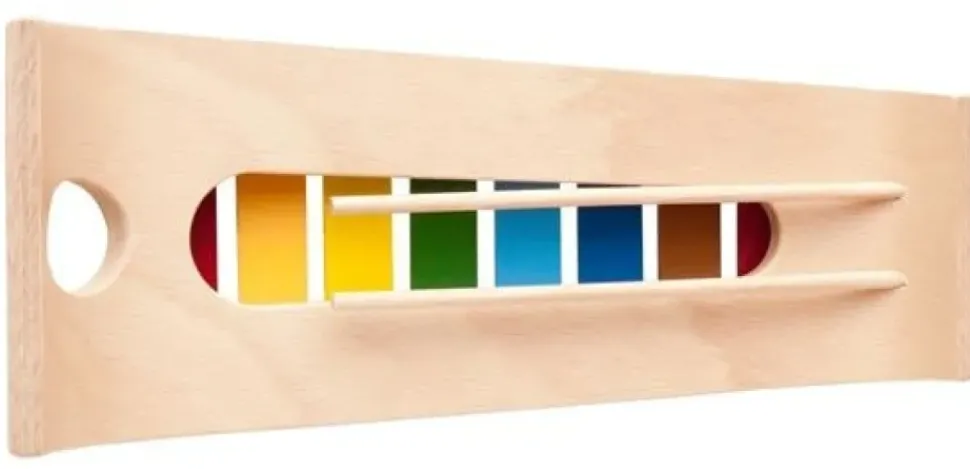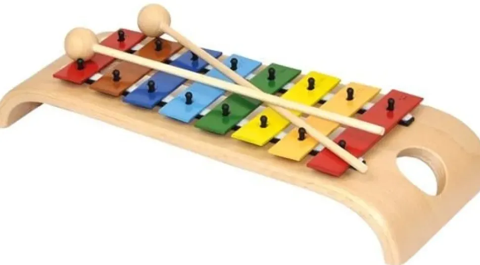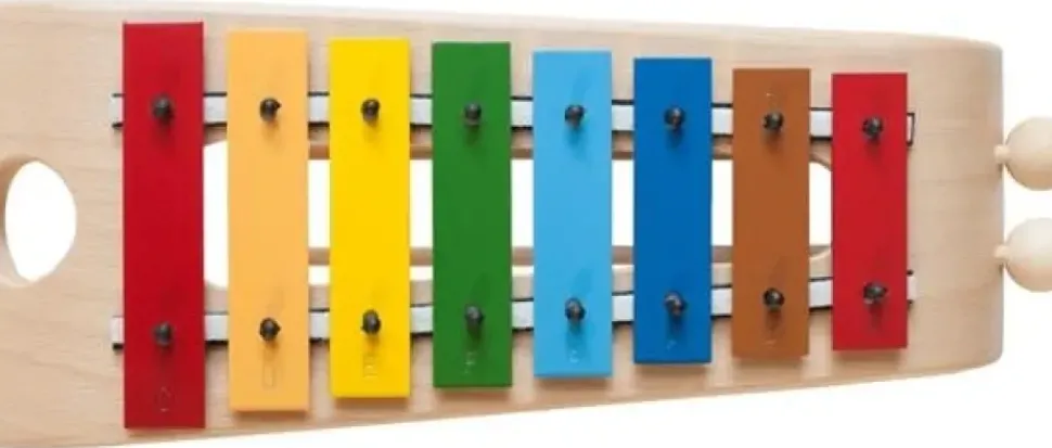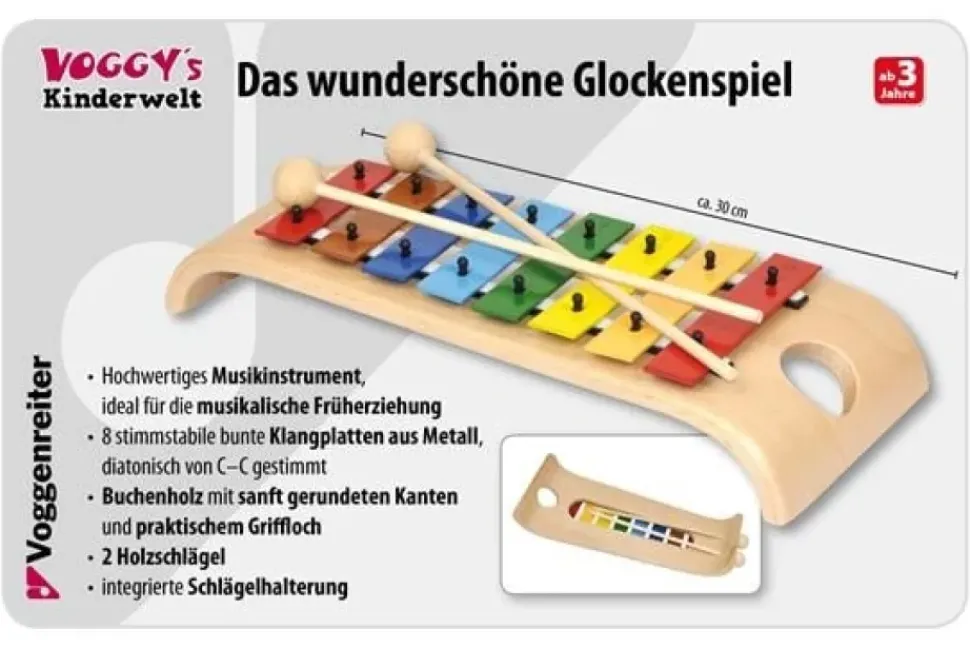 De gebogen klankbrug draagt 8 hoogwaardige kleurrijke metalen klankstaven. Zacht afgeronde randen en de wasbehandeling maken dit klokkenspel tot een echte "handvleier". De twee houten hamers kunnen gemakkelijk worden opgeborgen in de geïntegreerde houde