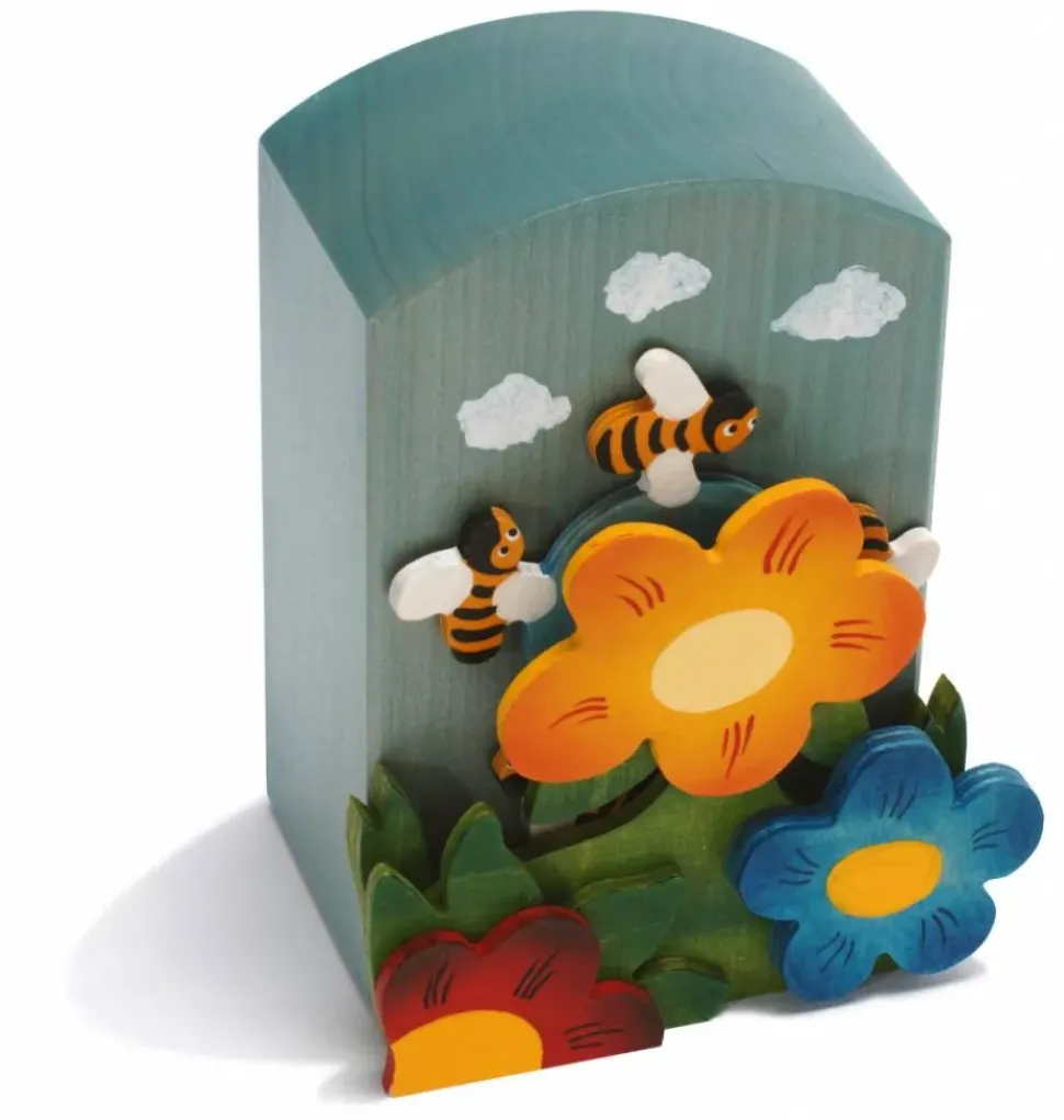 Een muziekdoosje met daarop in frisse kleuren geschilderde bloemen en bijen. Door de muziekdoos aan de achterkant op te winden en daarna aan te zetten gaan de bijen draaien. Van het Zwitserse merk Weizenkorn.