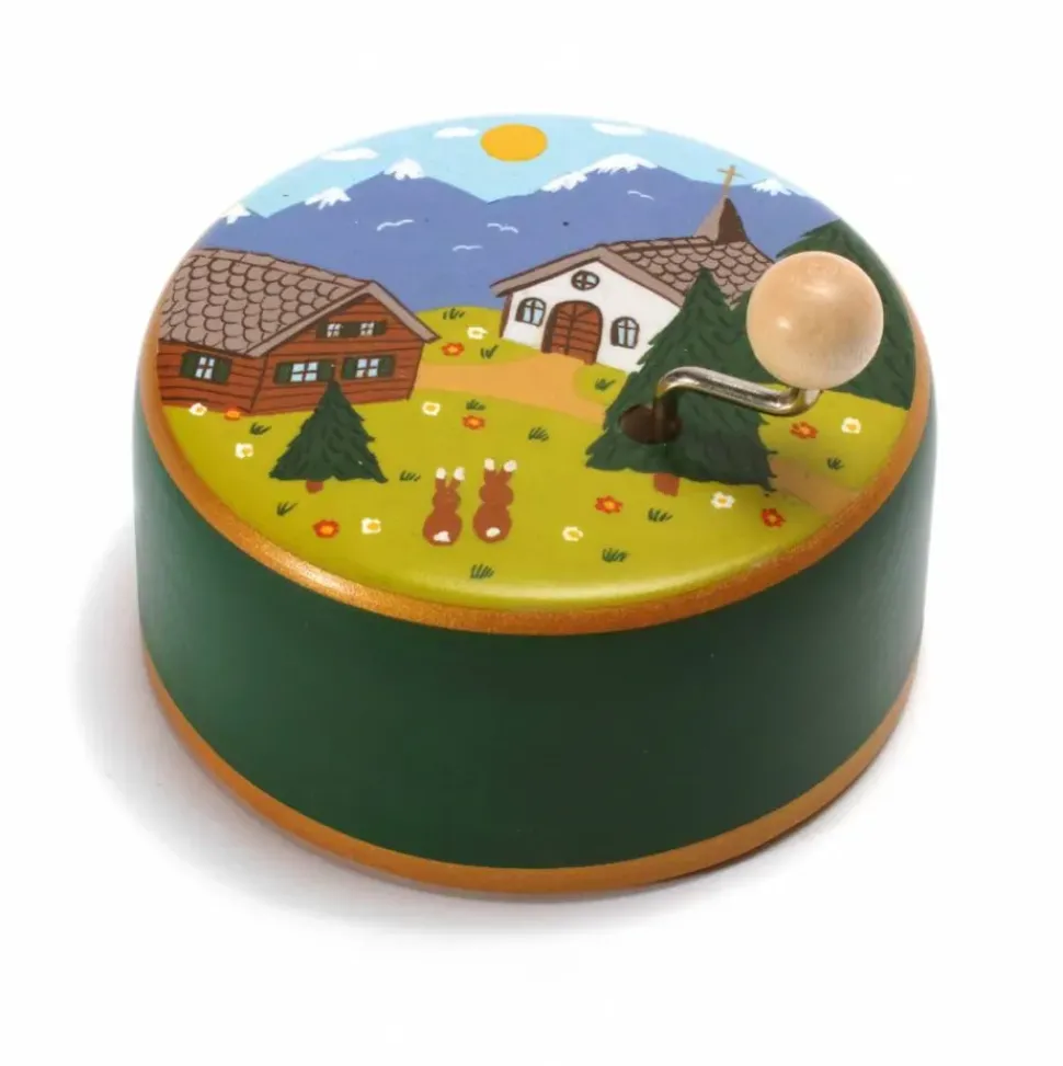 Een muziekdoosje of draaidoosje van Weizenkorn met daarop een boerderij landschap geschilderd. Hoor wat voor mooie melodie (Voorjaarslied) er gaat klinken als je aan de hendel gaat draaien. Hierbij valt de kleine zo in slaap.