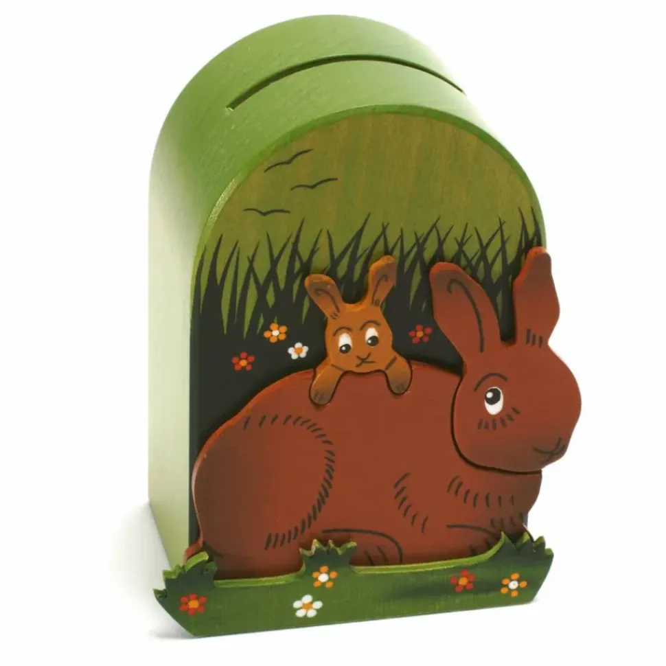 Een spaarpot van hout gemaakt in verschillende lagen zodat het een 3D effect geeft, met daarop moeder haas met bovenop haar rug haar jong.